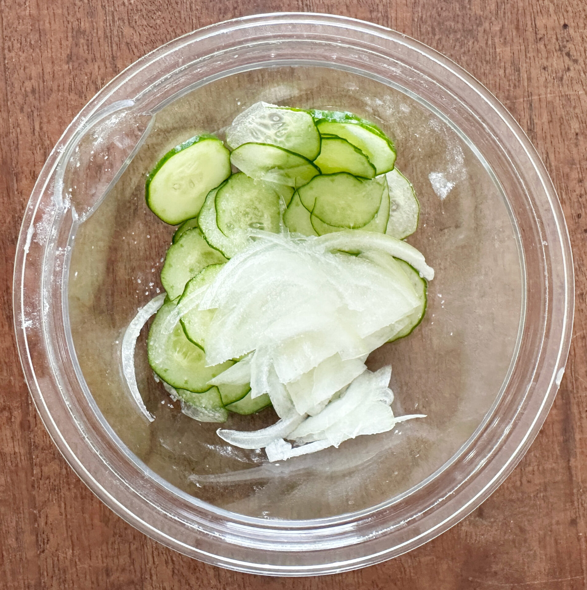 ❷ハムは1cm幅の短冊切りに、タマネギ、キュウリは薄切りにして塩をもみこみ、5分ほど置いて出てきた水分を絞る (タマネギの辛味が苦手な人は、その後水につけてもみ洗い後、水気を絞る)