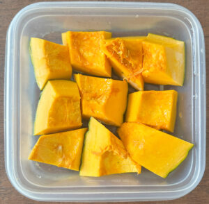 ※カボチャが硬くて切れない場合は、丸ごとならそのまま、カットされたものならラップに包んで電子レンジにかけ、包丁が入る程度まで加熱してから切ると楽です。丸ごとの場合は5~6分、1/4個なら1~2分程度です