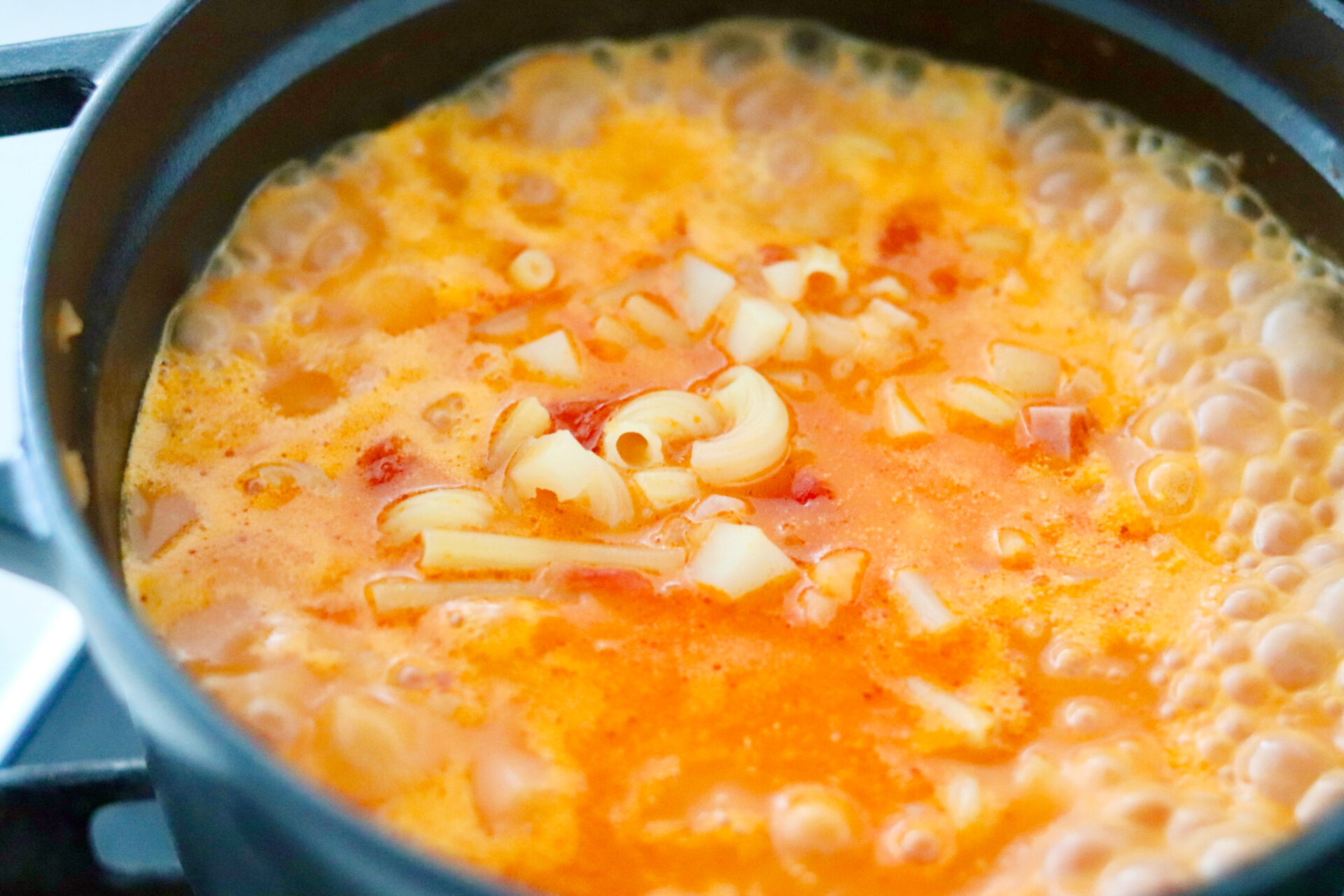 ❷❶にショートパスタを加えて袋の表記時間煮る。牛乳、バターを加えてひと煮立ちさせ、器に移してパセリを散らす。