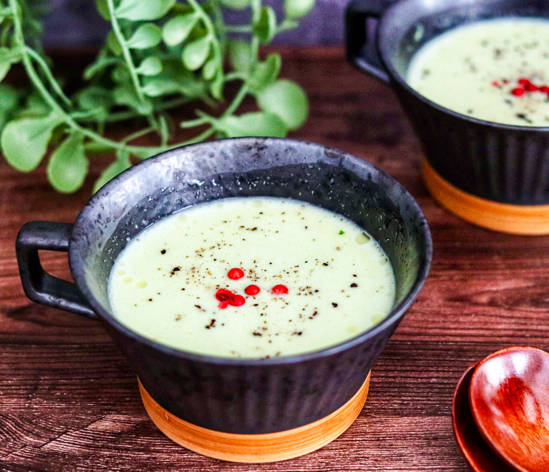 ❷ピューレ状になった❶を鍋に戻し、Ⓐを加えてふつふつするまで熱したら器に移し、粗びき黒コショウ、ピンクペッパーを散らす。