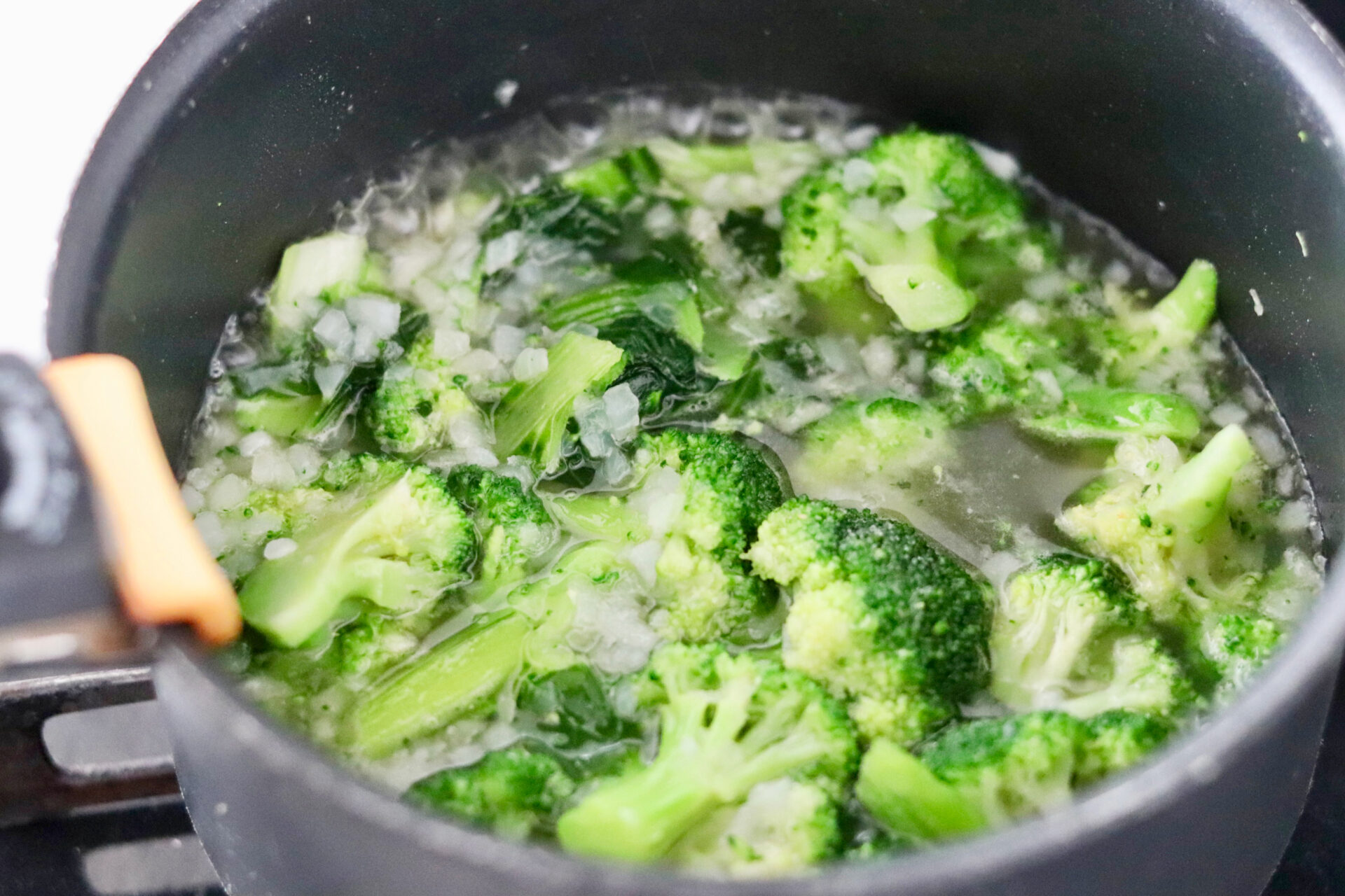 ❶オリーブオイルを中火で熱した鍋でコマツナ、ブロッコリー、タマネギを炒め、しんなりしたら水200ml(分量外)を加える。ふつふつしたらミキサーに移し、滑らかになるまで撹拌する。