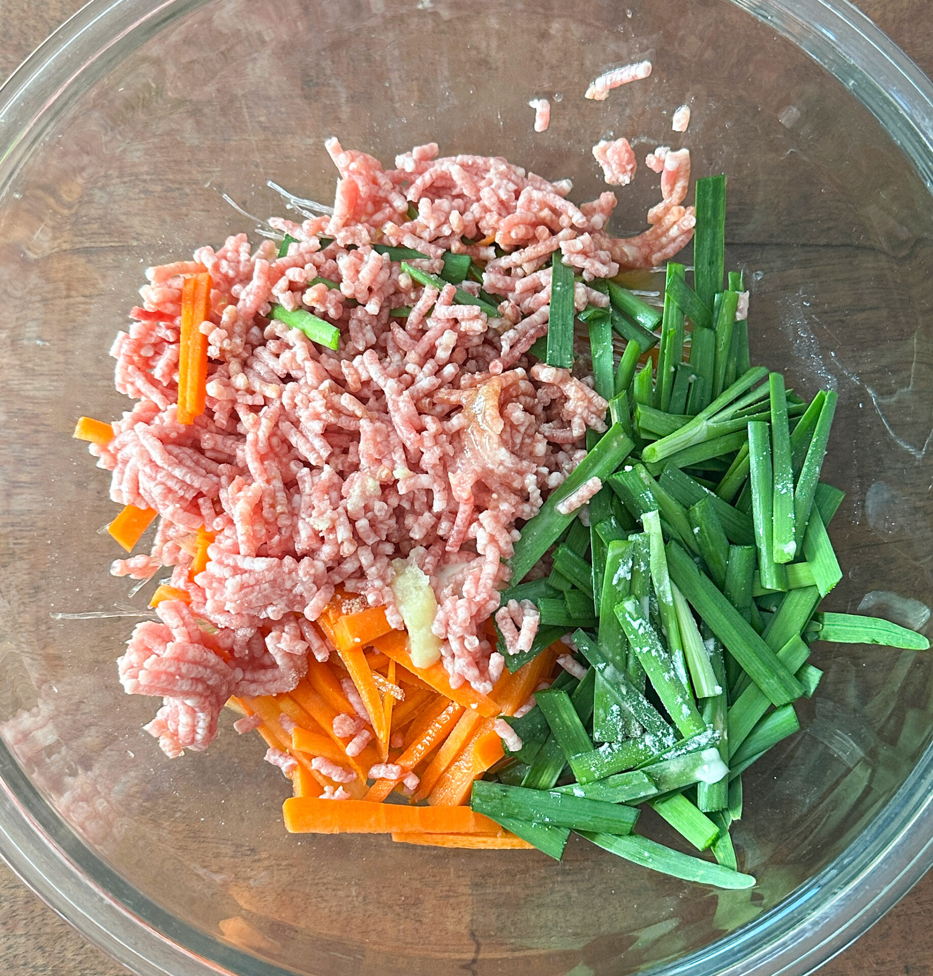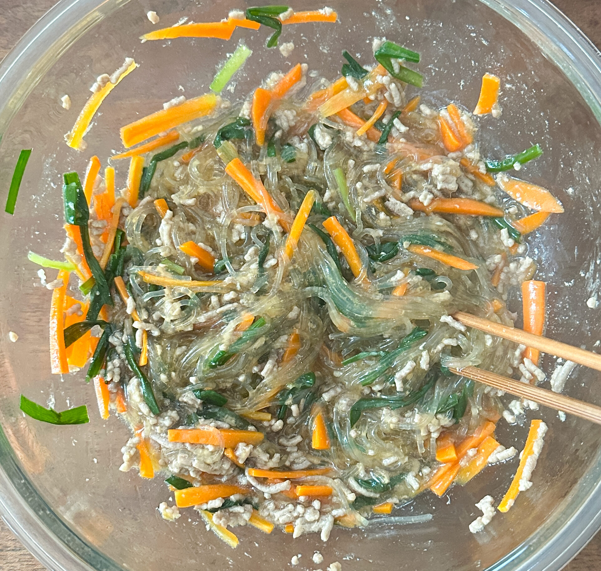 ❶ニンジンは細切りに、ニラは5cmの長さに切る。耐熱ボウルに春雨、ニンジン、ひき肉、ニラの順に入れ、合わせたⒶをかける。