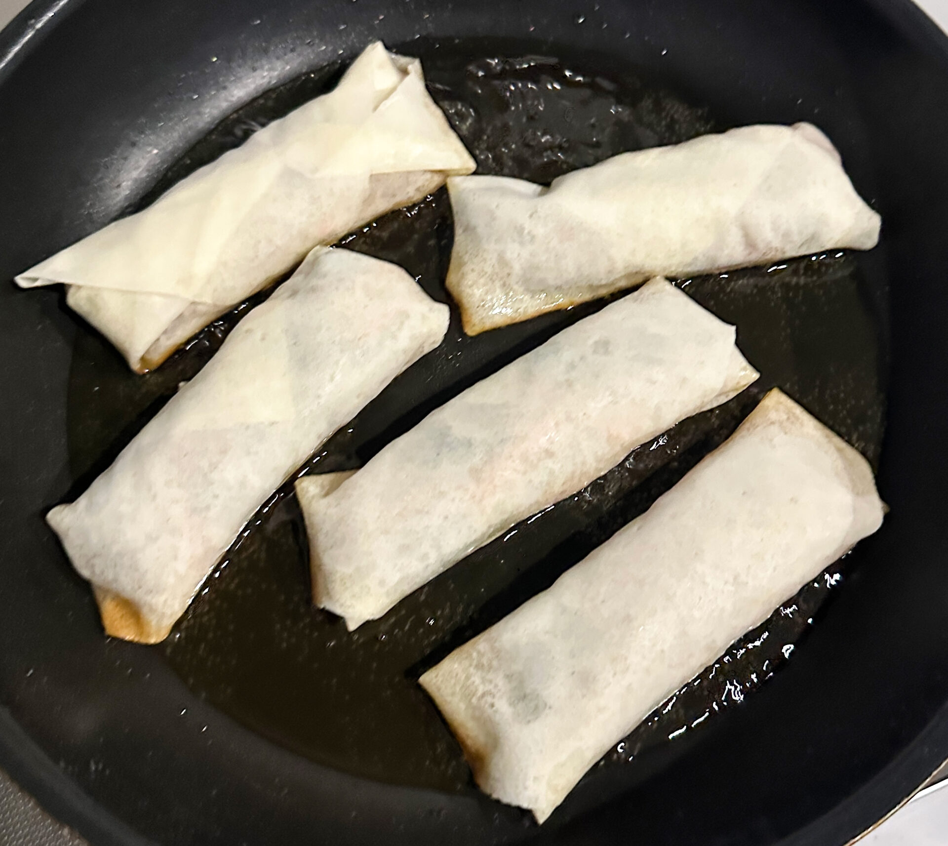 ❸春巻きの皮に❷を1/10量ずつのせて包み、巻き終わりを水で留める。フライパンに揚げ油を5mmほど入れて弱~中火で熱し、閉じ目を下にして春巻きを並べる。焼き目がついたら裏返し、両面こんがりしたら側面も立てて焼きつけ、油をしっかり切る。