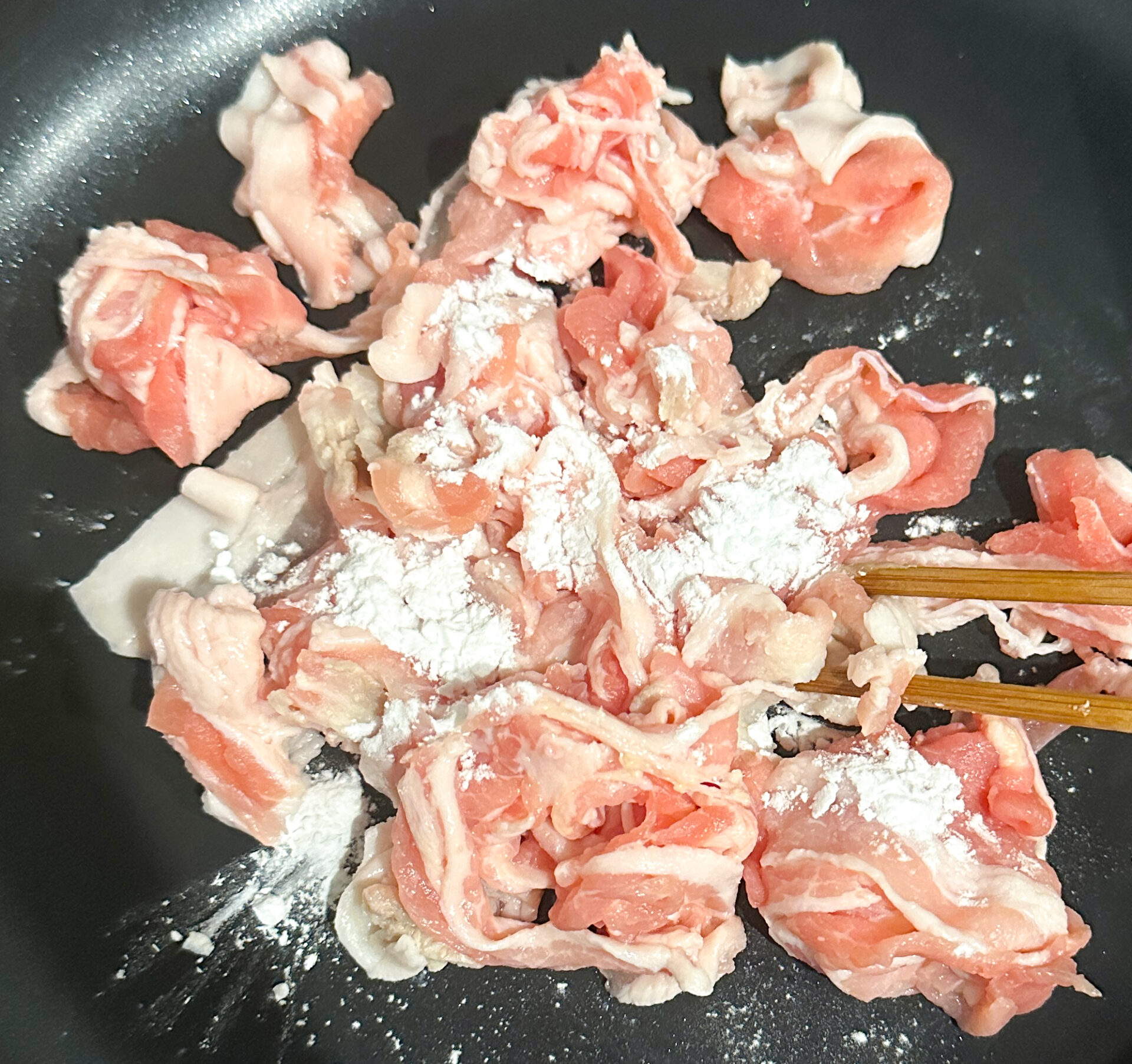 ❷豚肉は一口大に切り、フライパンに入れて片栗粉をまぶす。サラダ油を入れて中火にかけ、ニンニク、ショウガを加えて炒める。