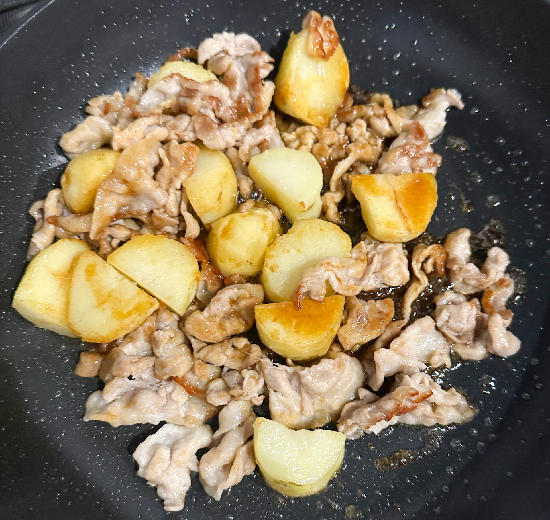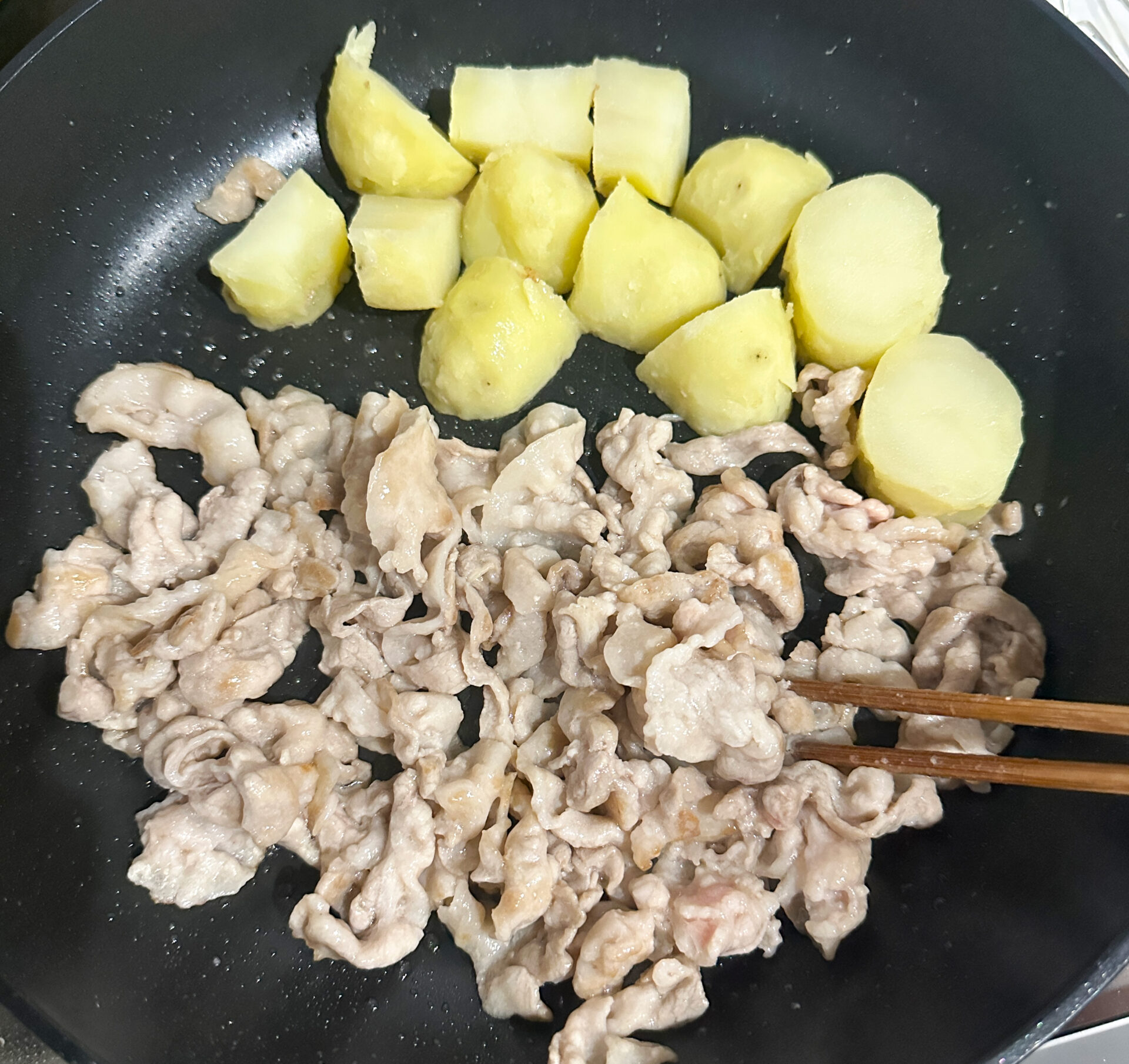 ジャガイモはメークインのほうが切った時に崩れにくいのでオススメ。お肉は豚こまでも鶏肉でも牛肉でもなんでもおいしいです!