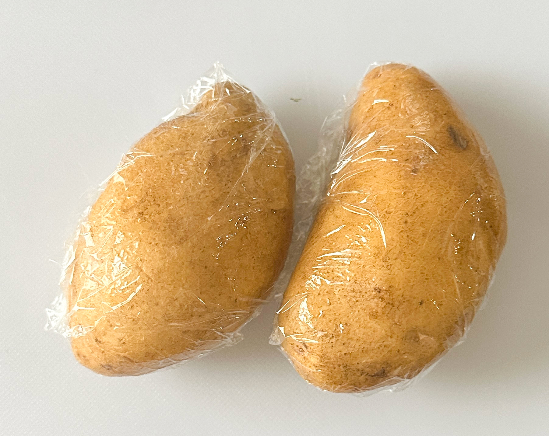 ❶ジャガイモは洗って水気がついたままラップに包み電子レンジ(600W)で4分、まだ硬ければ裏返して1分加熱する。ラップごと冷水につけ、粗熱が取れたら皮をむき、2㎝の厚さの半月切りにする。