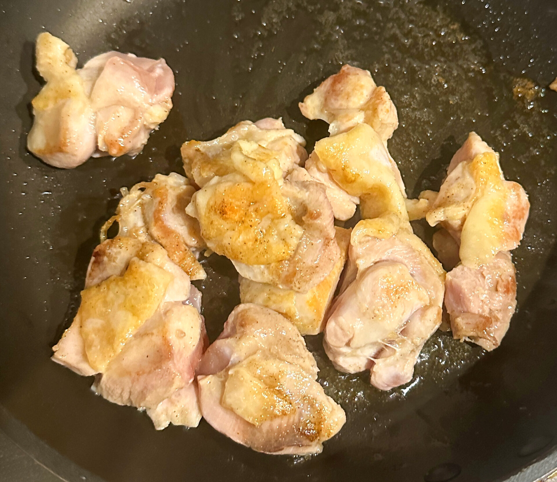 ❶ダイコンは1㎝厚さの半月切りにする。鶏モモ肉は一口大に切り、塩、コショウを各少々ふる。