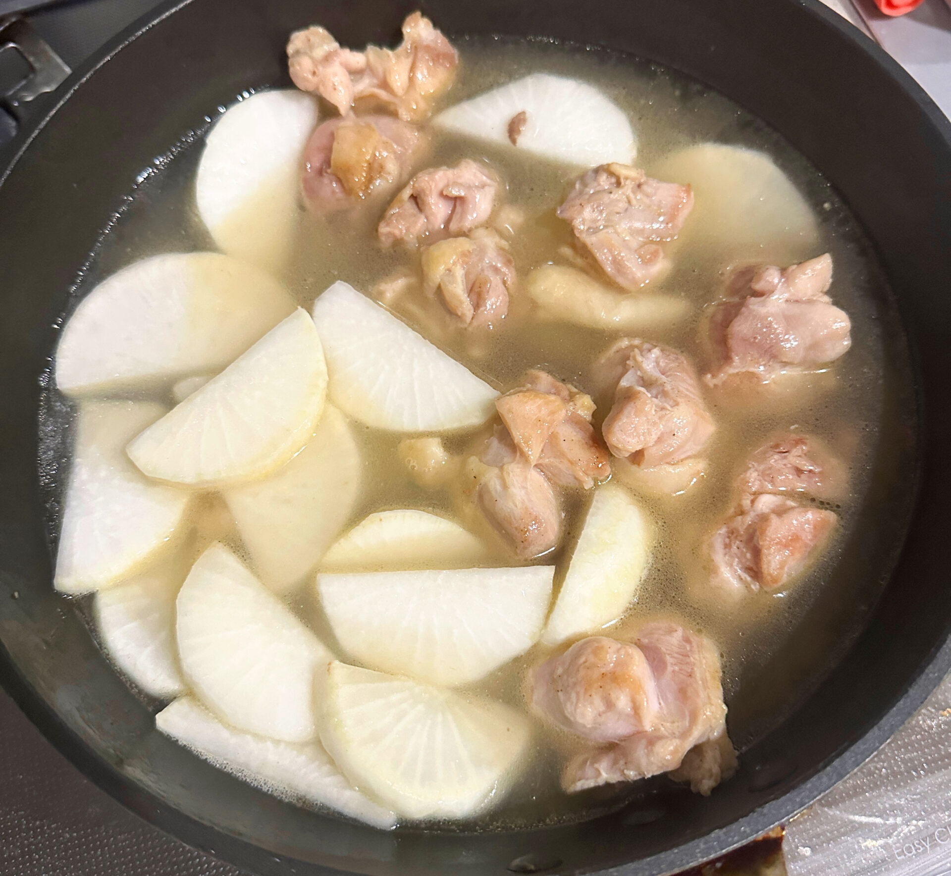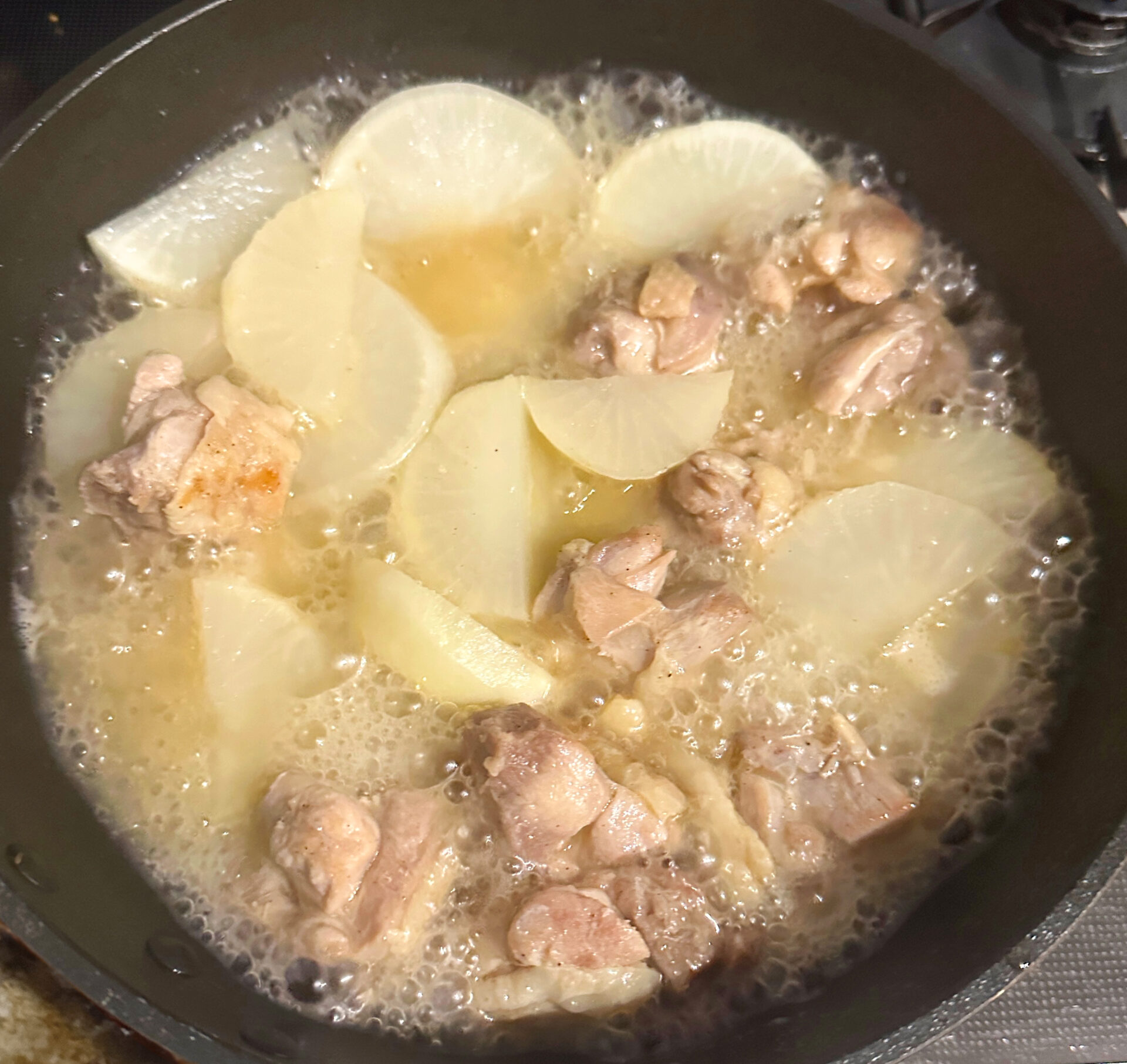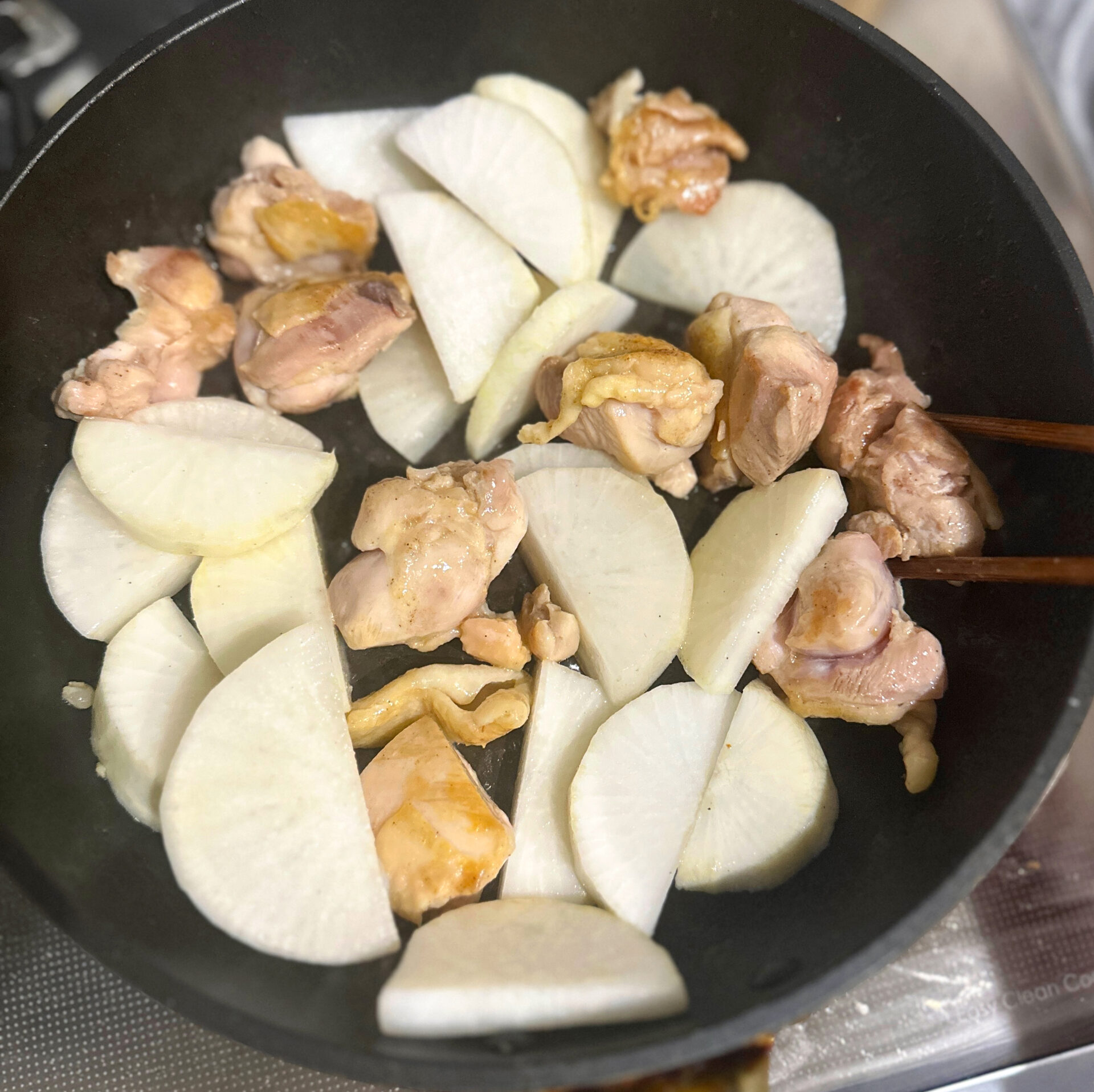 ❷フライパンにゴマ油を中火で熱し、鶏モモ肉の皮目を下にしておく。こんがりしたら裏返し、空いているところにダイコンを加えて炒める。油が回ったらⒶを入れ、アルミホイルなどで落としぶたをして弱~中火で約10分、軟らかくなるまで煮る。