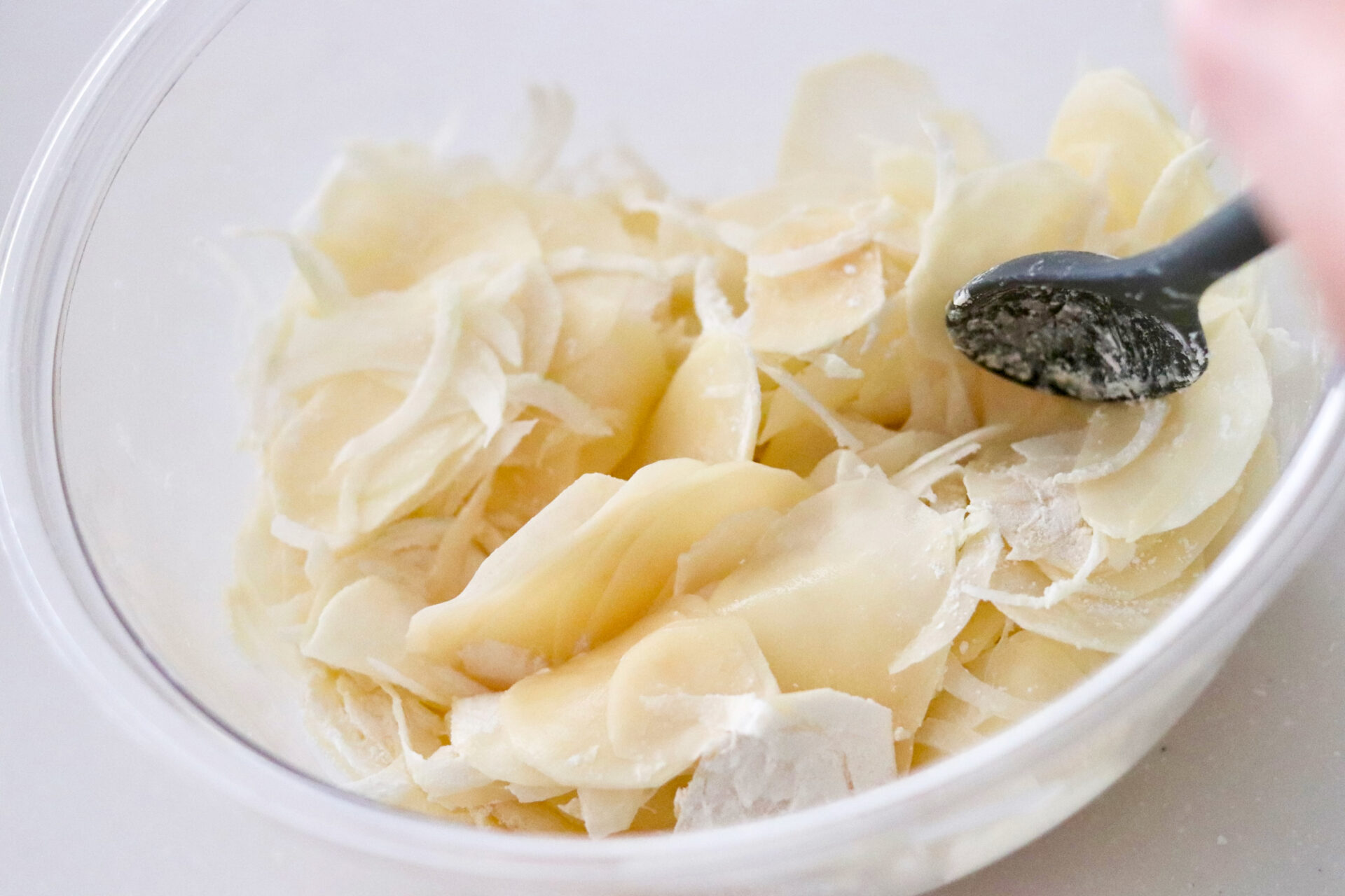 ❶ 耐熱ボウルにジャガイモ、タマネギを入れて薄力粉を加えて全体に混ぜまぶす。