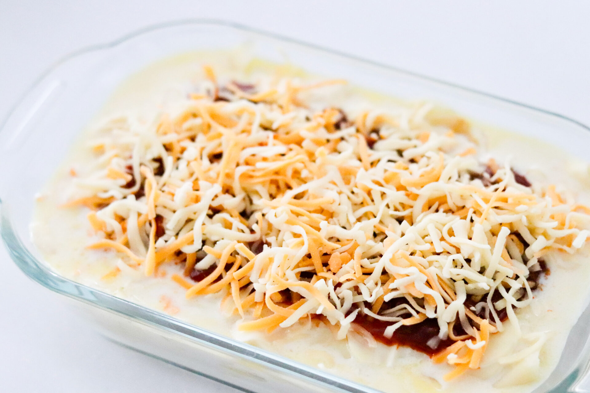 ❷ ❶にⒶを入れて牛乳を注ぎ、ふんわりラップをかける。レンジ(600W)で5分加熱し、よく混ぜて耐熱容器に入れてミートソースをかけ、ピザ用チーズをたっぷりのせる。