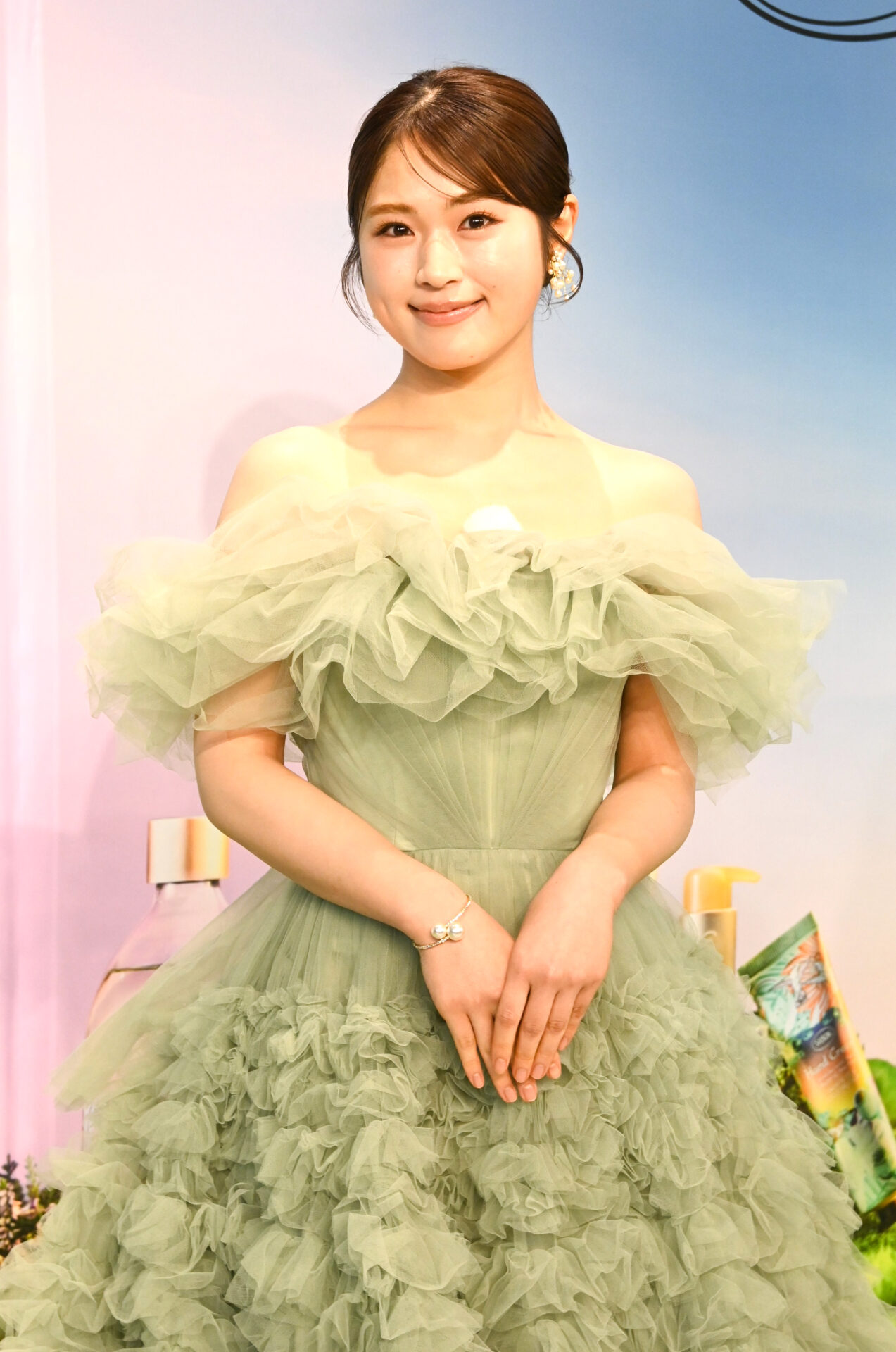 イベントでは、春色の淡い若草色のロングドレスで登場した渋谷さん。