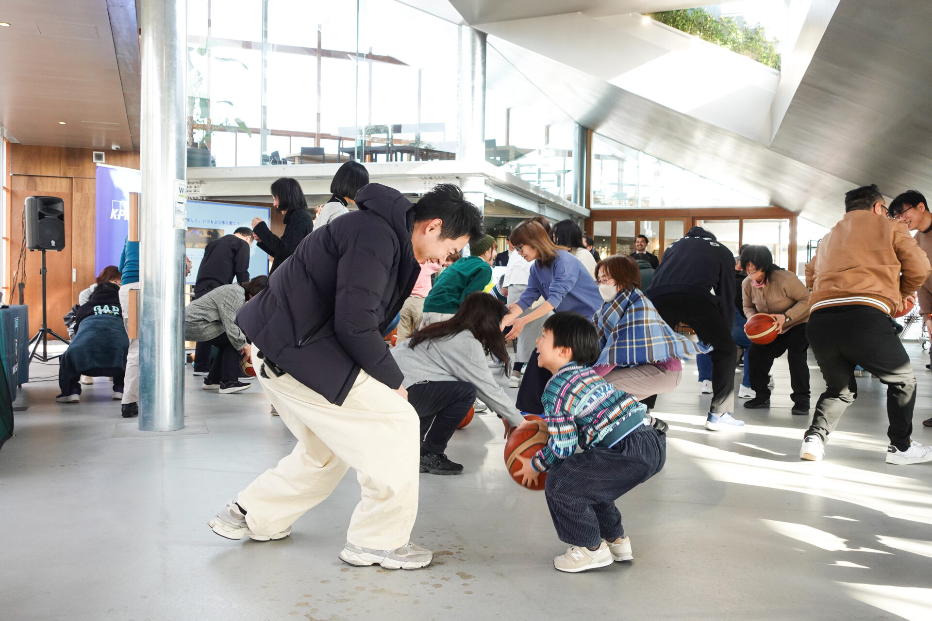 講演後は、神戸ストークスの元選手で、現U18ヘッドコーチの松崎賢人さんによる「いつもより10分多く動こう!日常に取り入れられる運動で健康な身体づくり」と題したアクティビティが行われました。