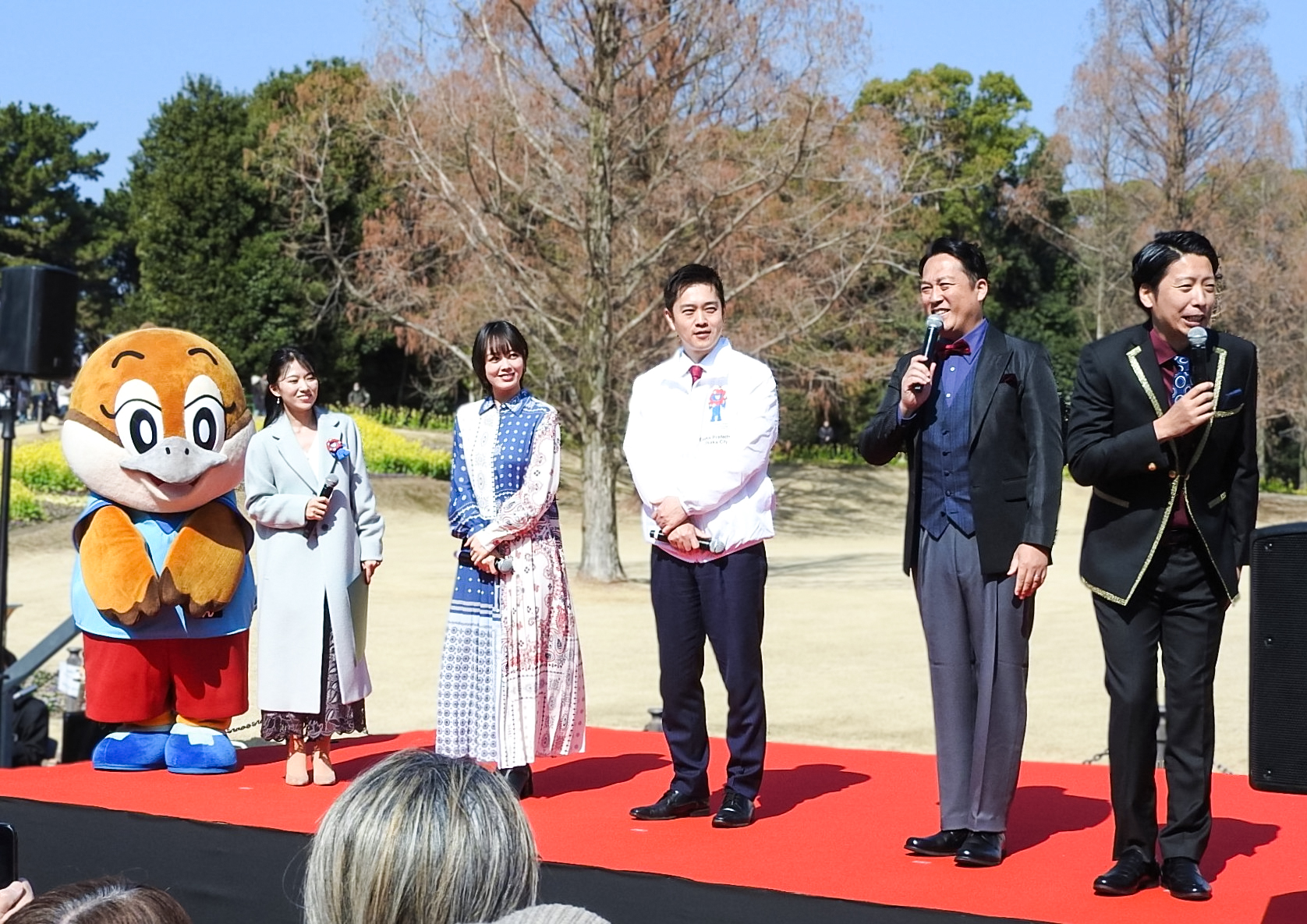 石塚理奈さんのMCで、吉村洋文大阪府知事と大阪府広報担当副知事のもずやん、ゲストに伊原六花さん、藤崎マーケットのお二人がご登壇。