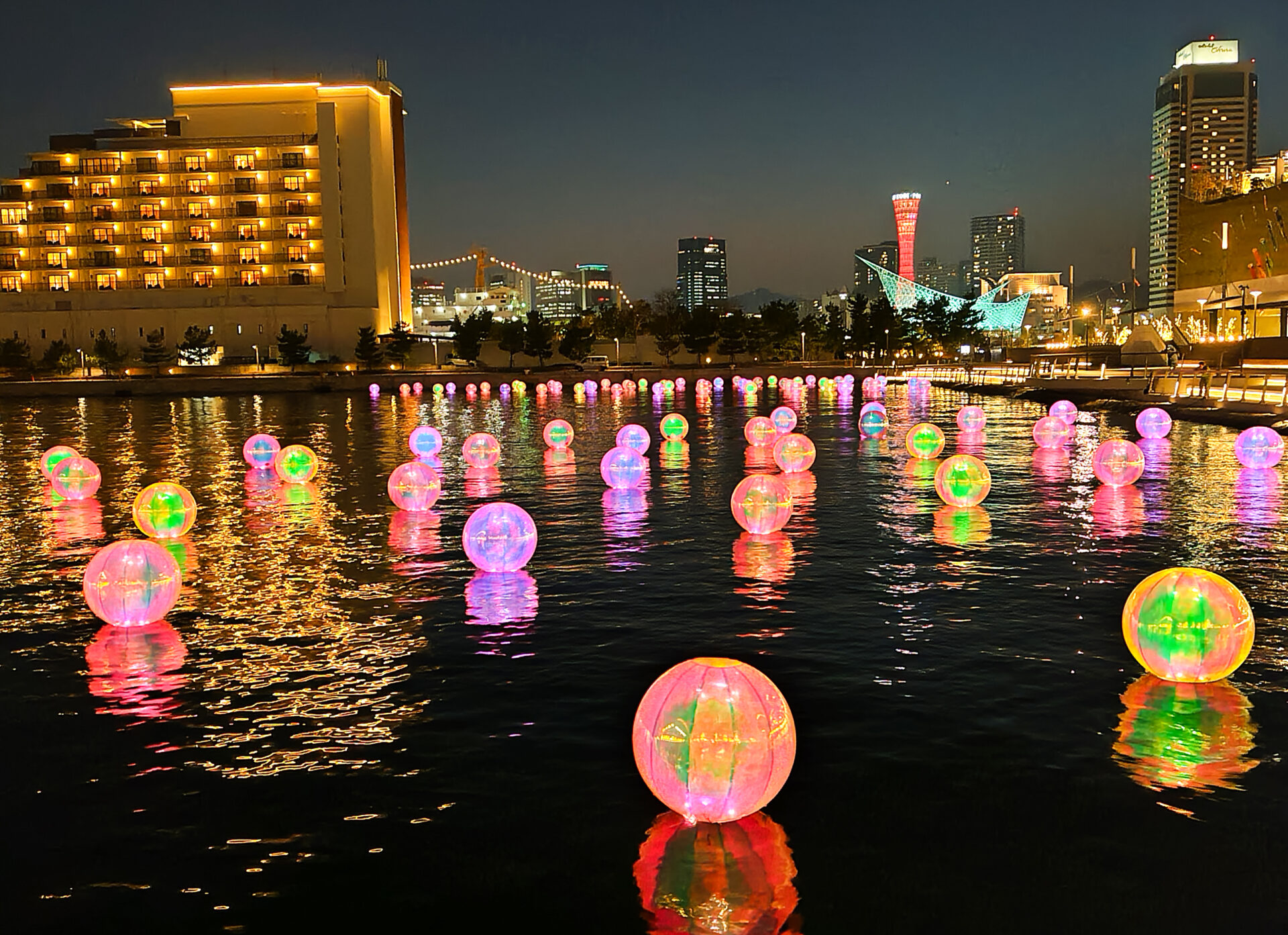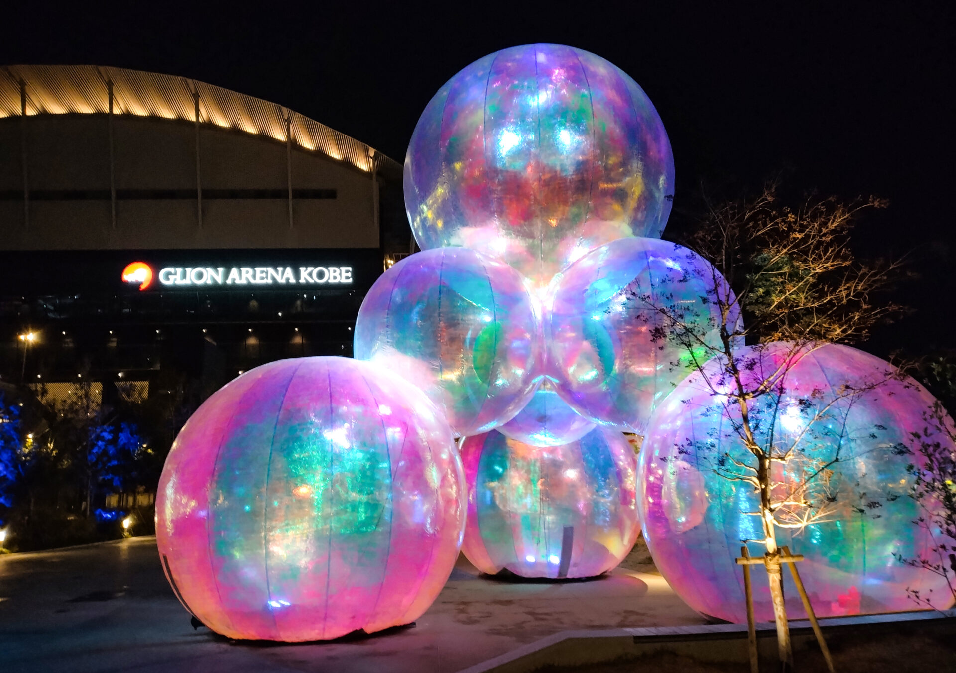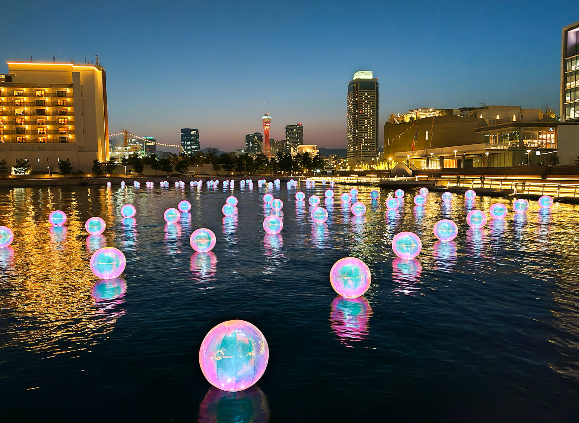 光を反射する素材で作られたバブルアートは、日中はシャボン玉のようなきらめき、夜はライトアップしたカラフルなイルミネーションとして、ウォーターフロントを華やかに彩っています。