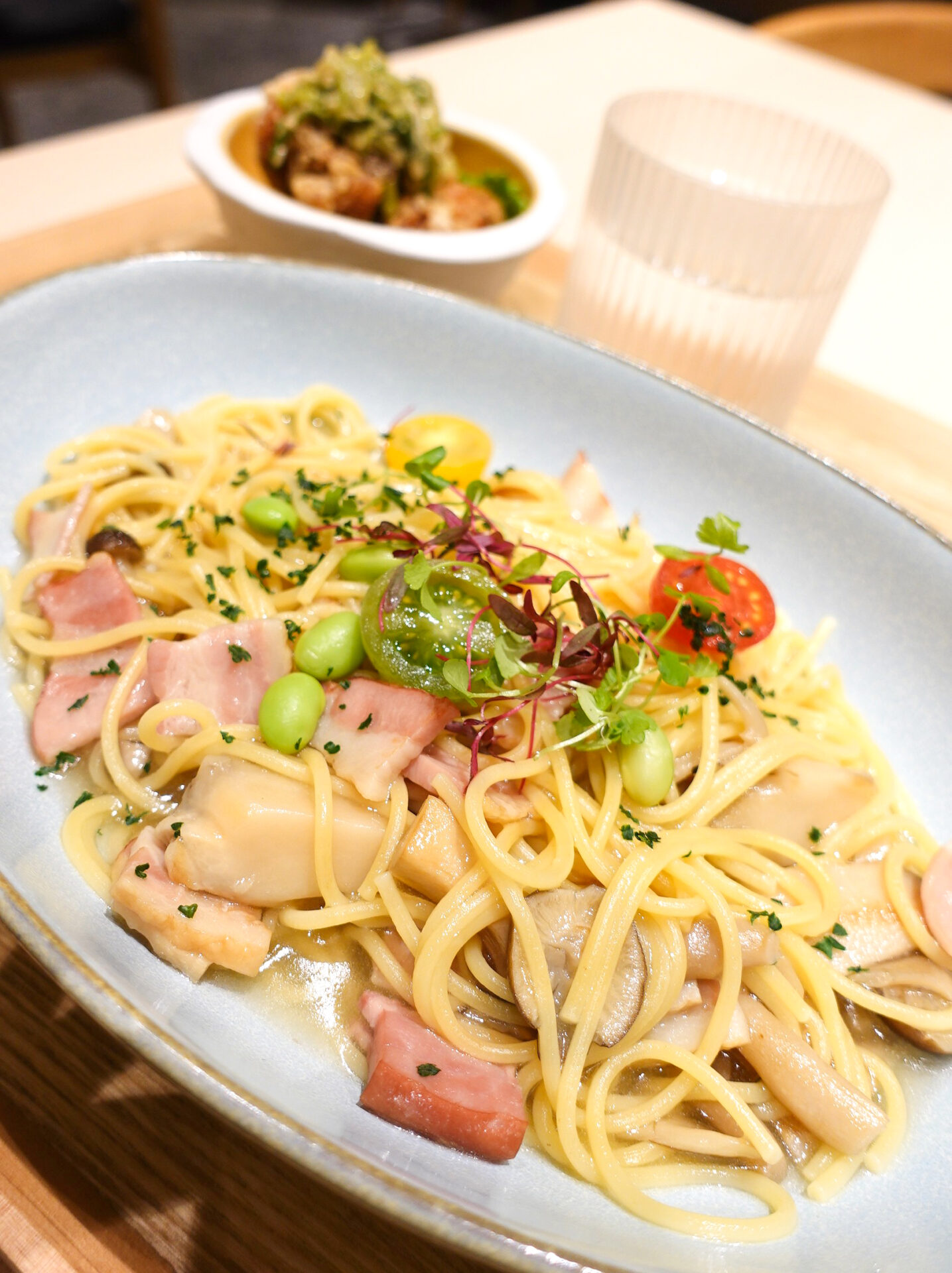 この日は料理長おすすめの「鶏から揚げ山椒ネギダレ風味」と「きのこと香ばしベーコンの塩麹パスタ」をいただきました。