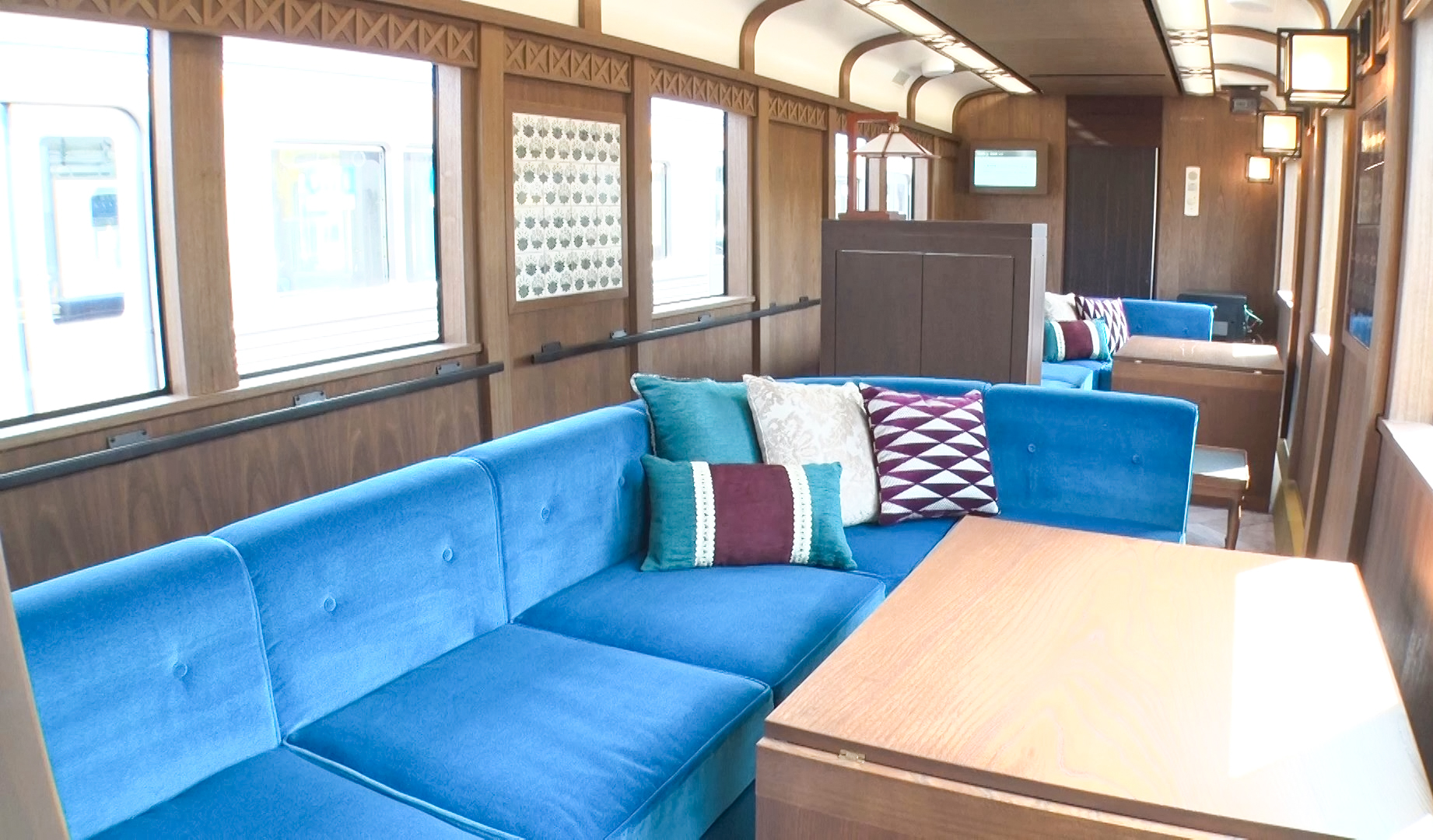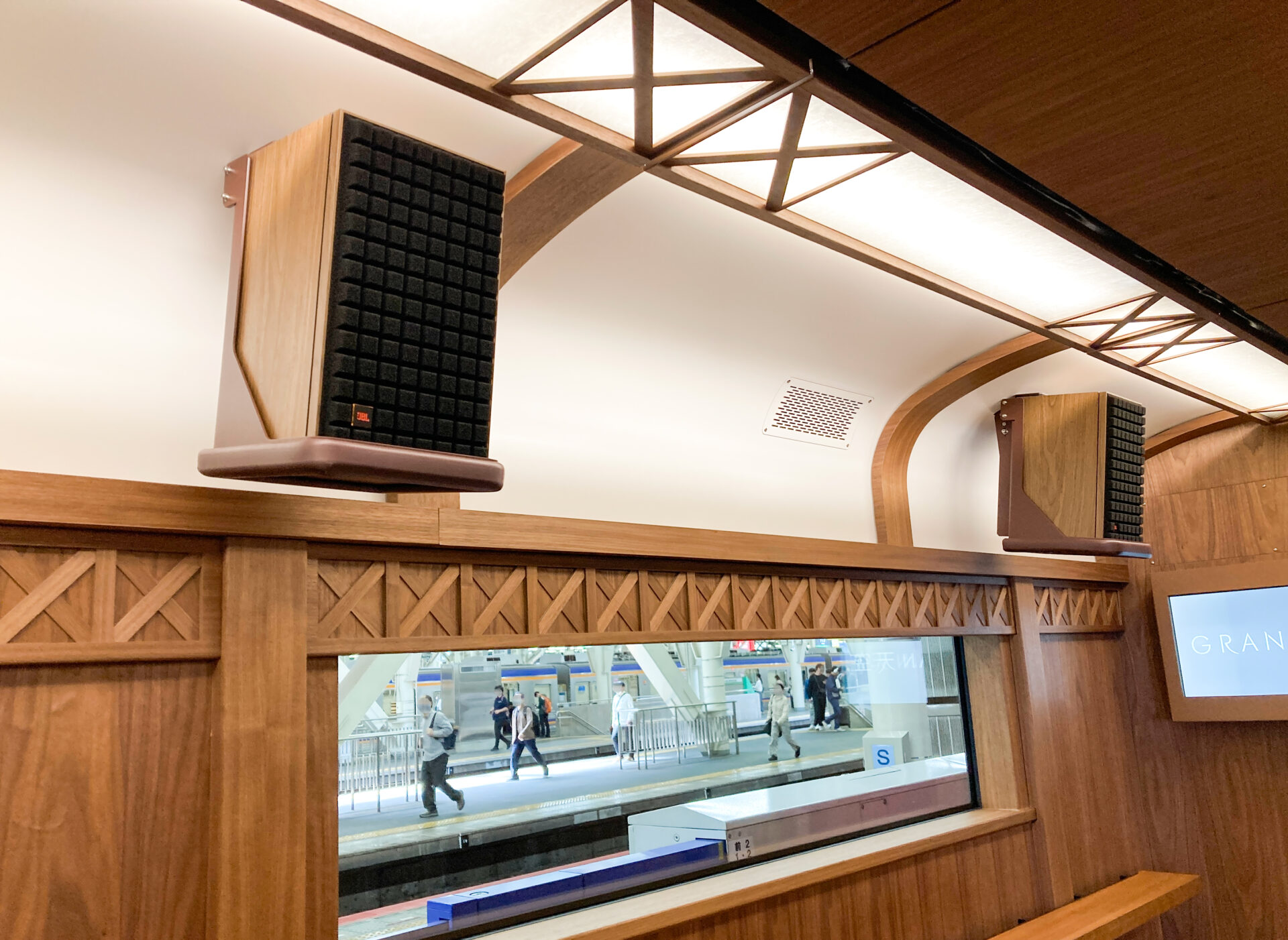 4車両とも「スタッフが選曲した」軽音楽がバックに流れ、特に3号車はJBL製の高音質スピーカーを6台搭載、電車とは思えないラウンジ空間を演出します。
