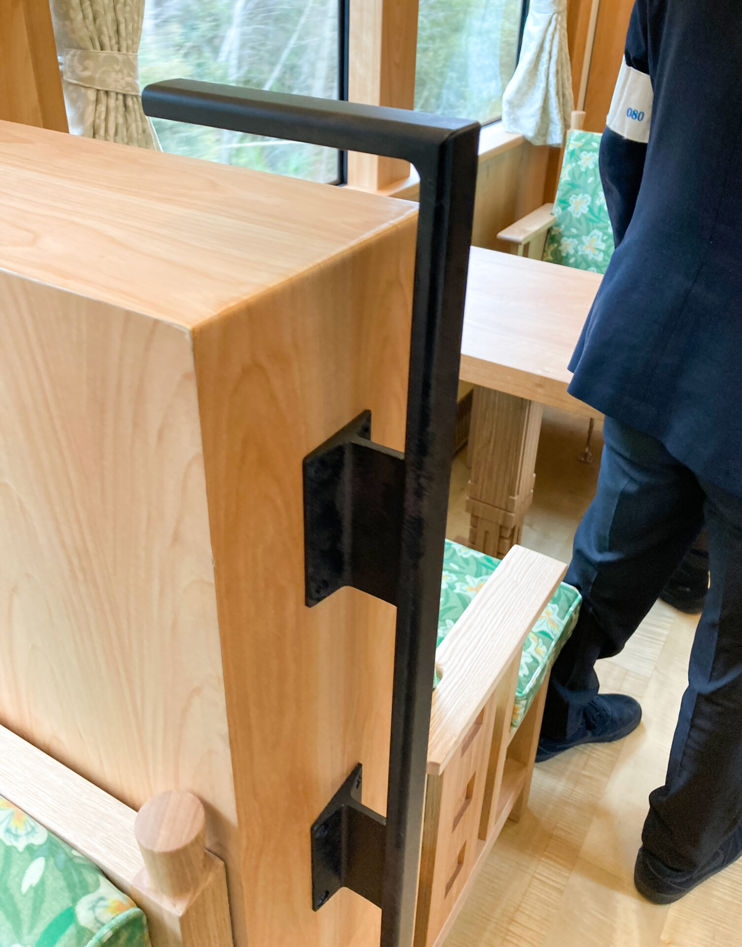 これは南海電鉄で昔、使っていたレールを加工したもので、3号車のバーカウンターの背面のレンガ(※先に掲載しました、アテンドの皆さんが勢ぞろいしたロビーラウンジの写真をご覧ください)は、昔なんば駅舎で実際に使っていたのを再利用しているといい、南海らしさが随所に散りばめられています。