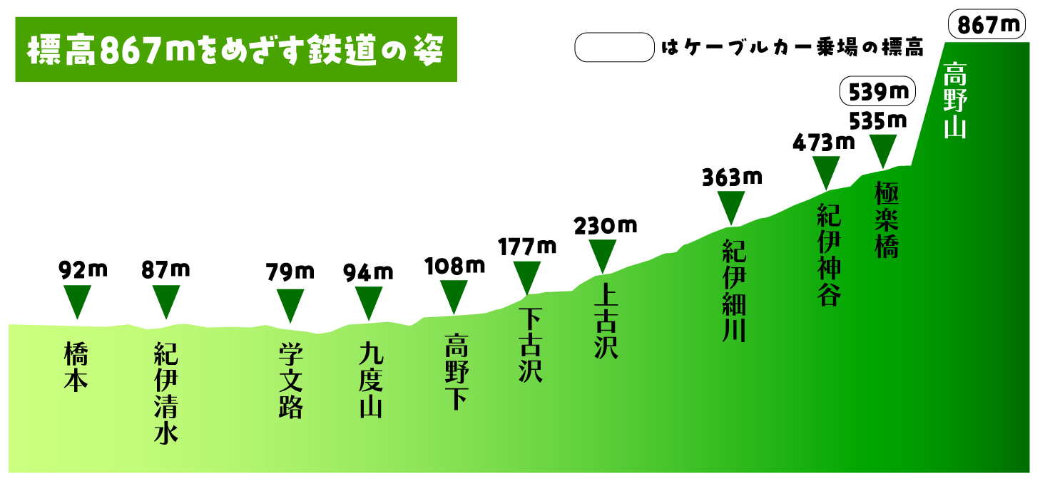 加えて、橋本~極楽橋駅間は「全長約20kmで約440mの勾配」という大手私鉄では大変、珍しい国内有数の山岳路線であることを知りました。