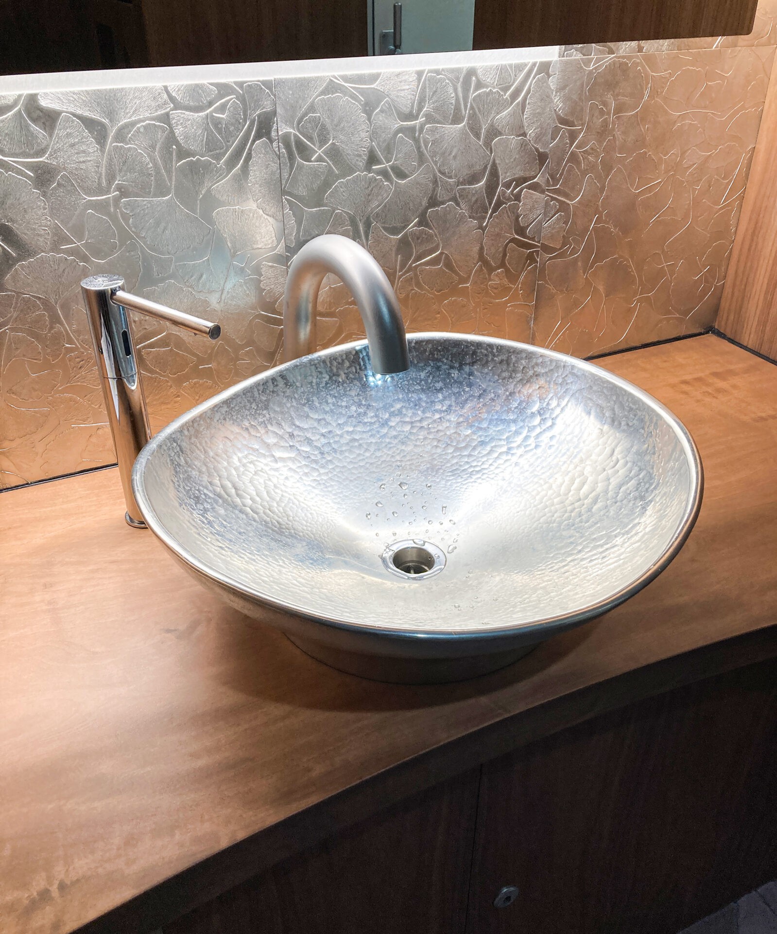 3号車のパウダーコーナーの手洗い鉢は300年以上続く「大阪浪華錫器」の職人が手がけた錫製です。