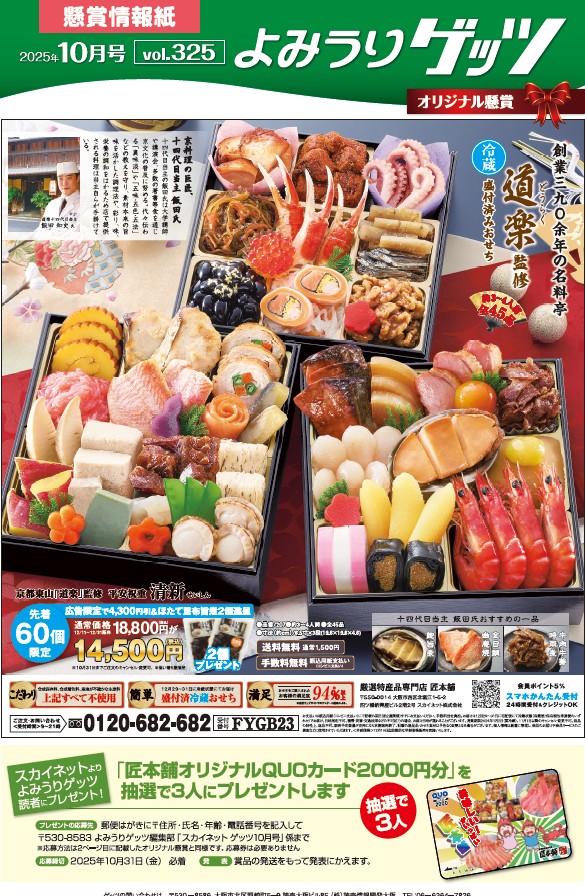懸賞情報紙よみうりゲッツ今月のプレゼント 10 月 の紙面 よみうりゲッツとは 10月号の応募はこちら 応募は読売グループのオンラインサービスが使える「読売ID」の会員登録(無料)が必要になります。 賞品発送は、当社やプレゼント提供者、読売新聞販売店からさせていただきます。 ※価格は全て消費税を含む総額表示です 応募締め切り 2025年10月31日(金)23時59分 10 月のプレゼントは よみうりゲッツとは