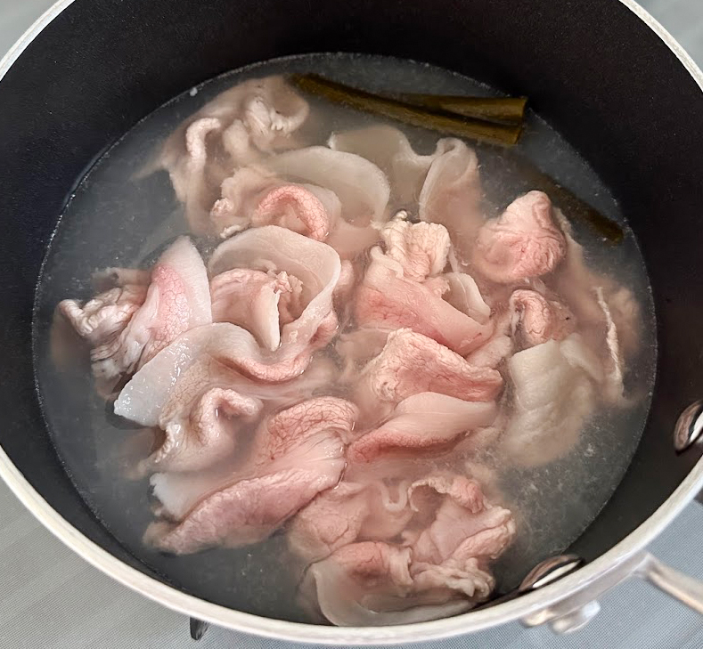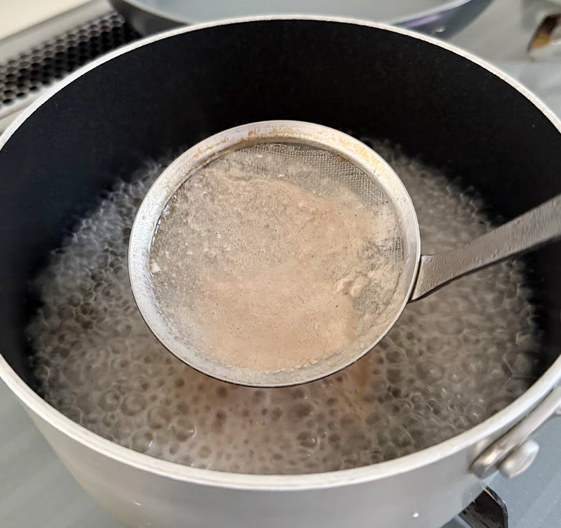 ❷小鍋を中火にかける。煮立ってきたら豚肉を入れて色が変わるまで箸で揺らしながらゆで、ザルにとる。煮汁を一度煮立て、アクを丁寧にすくう。