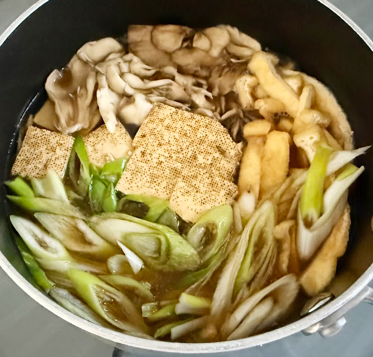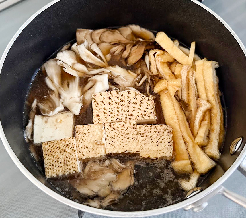 ❸❷にⒶを加えて、➊の豆腐、油揚げ、マイタケ、長ネギを入れて3分ほど煮る。具が温まったら❷の肉を戻し入れ、ひと煮立ちさせて火を止める。