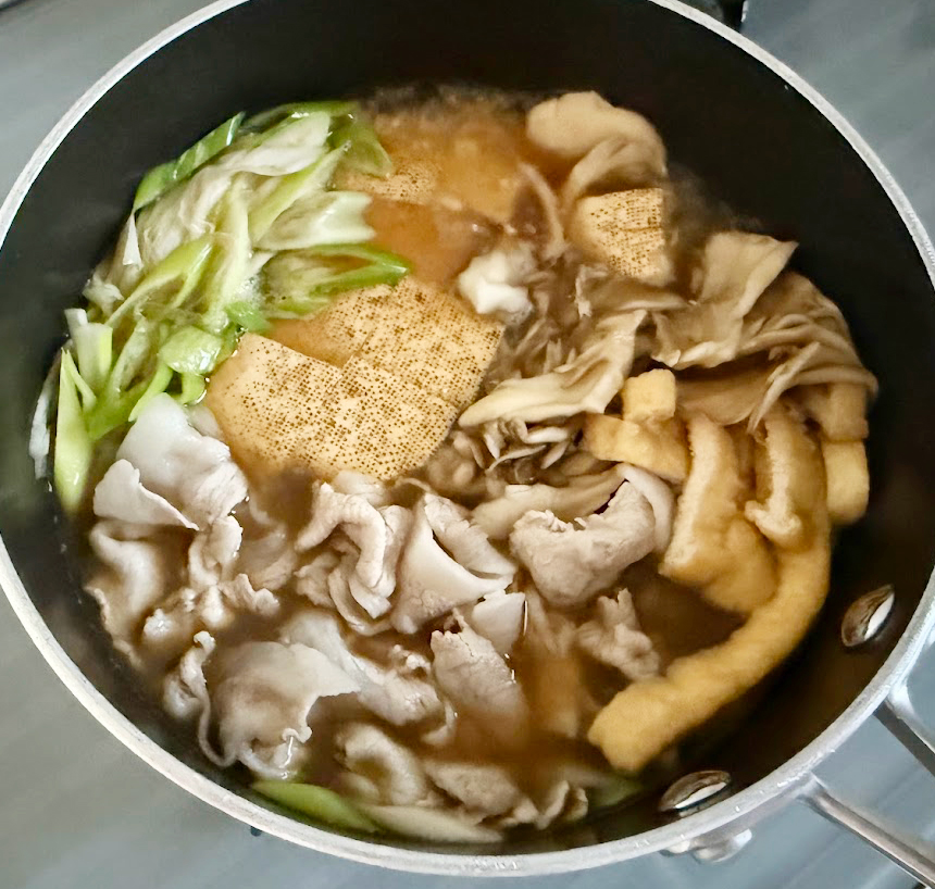 何気ない素材の組み合わせですが、しっかりしたうまみの昆布のお出汁に豚肉、マイタケ、長ネギといくつもの素材の味や香りが重なって、最後まで汁を飲み干したくなるおかずになります。