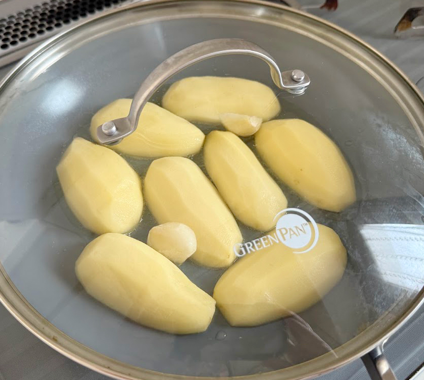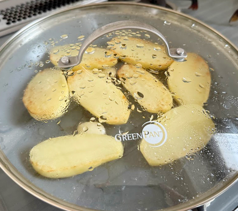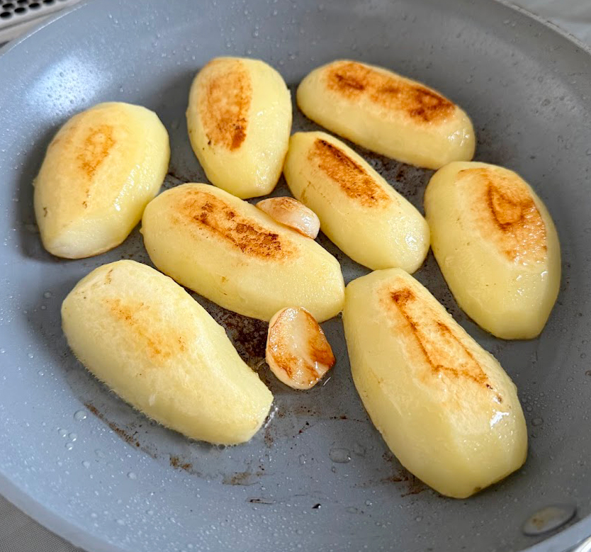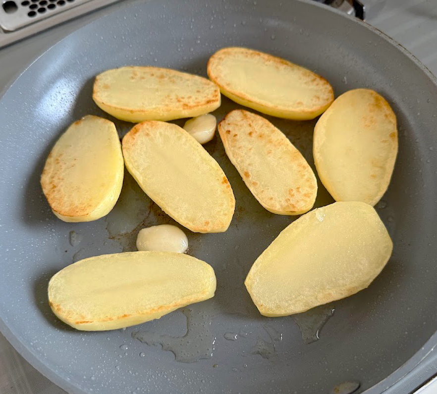 ❶ジャガイモは縦に半分に切り、2分ほど水にさらす。水気を切ってオリーブオイルをひいたフライパンに並べ、ニンニクも入れて蓋をして中火で表5分、裏5分ずつ蒸し焼きにして火を通す(時間がなければ切ったジャガイモをレンジ加熱してもOK)。