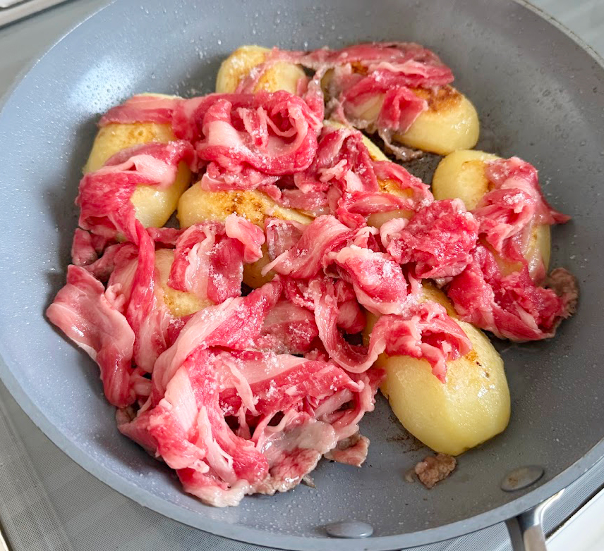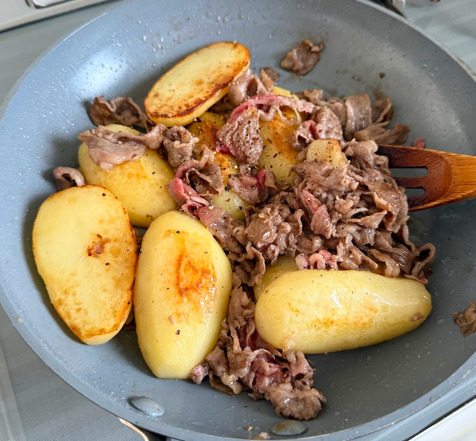 ジャガイモにニンニクの香りを移しながら、じっくりとフライパンで蒸し焼きにし、そこにさっと炒めたコクとパンチのある牛肉を合わせて粒マスタードの酸味で仕上げます。