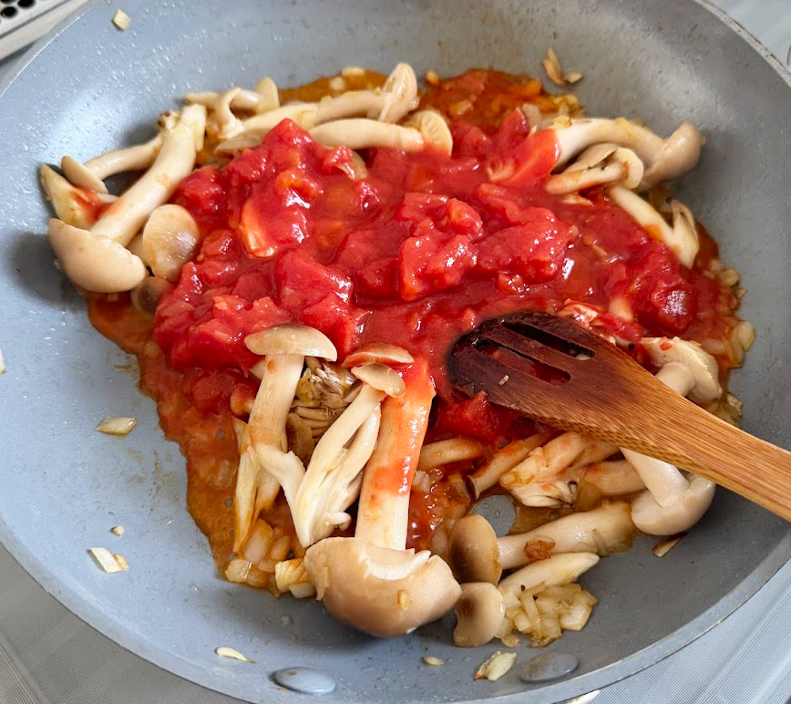❸空いたフライパンにオリーブオイルを少し足し、タマネギとシメジを炒める。しんなりしてきたらトマト缶を加えて少し煮詰め、Ⓐを加えて味を調える。