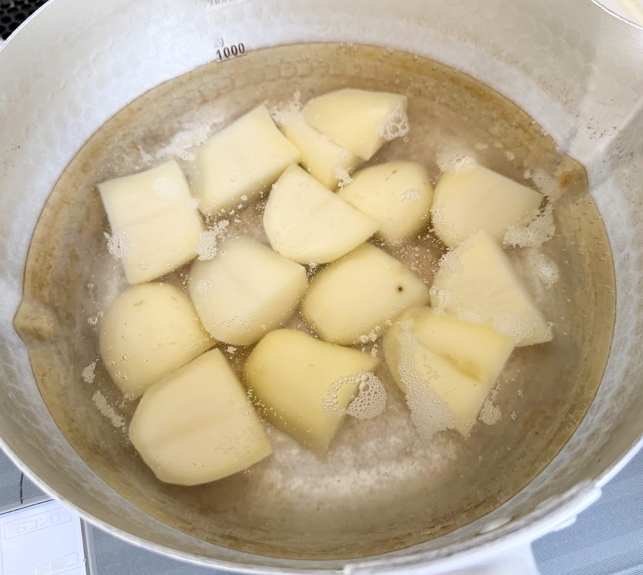 ❷鍋にジャガイモを入れてひたひたまで水(分量外)を注ぎ、塩少々を入れて串がスッと通るまで12~13分ゆで、湯を捨ててコンロの上でゆすって粉吹きイモにする。熱いうちにフォークでつぶし、塩とコショウをふる。