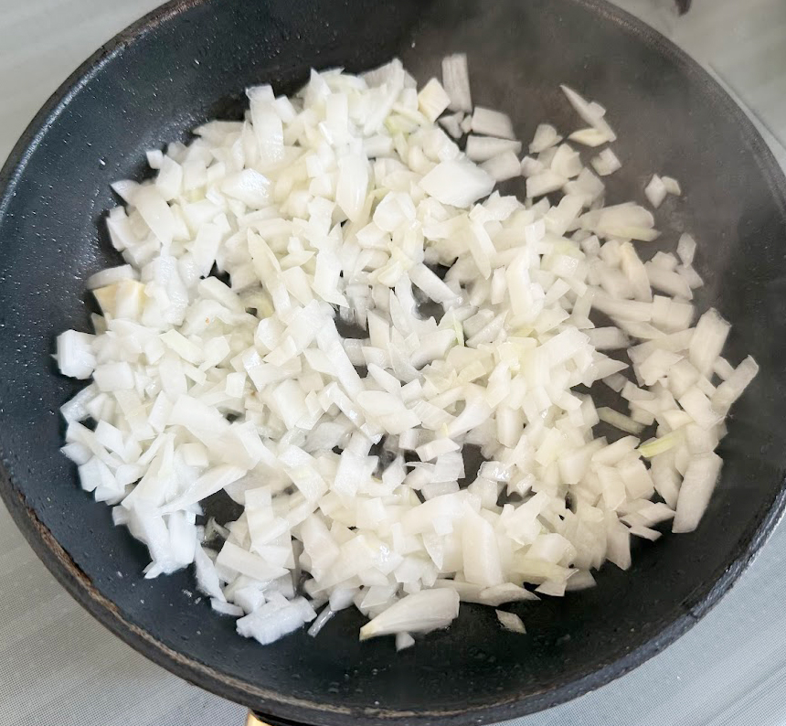 ❶タマネギはみじん切りに、ジャガイモは3㎝角に切る。