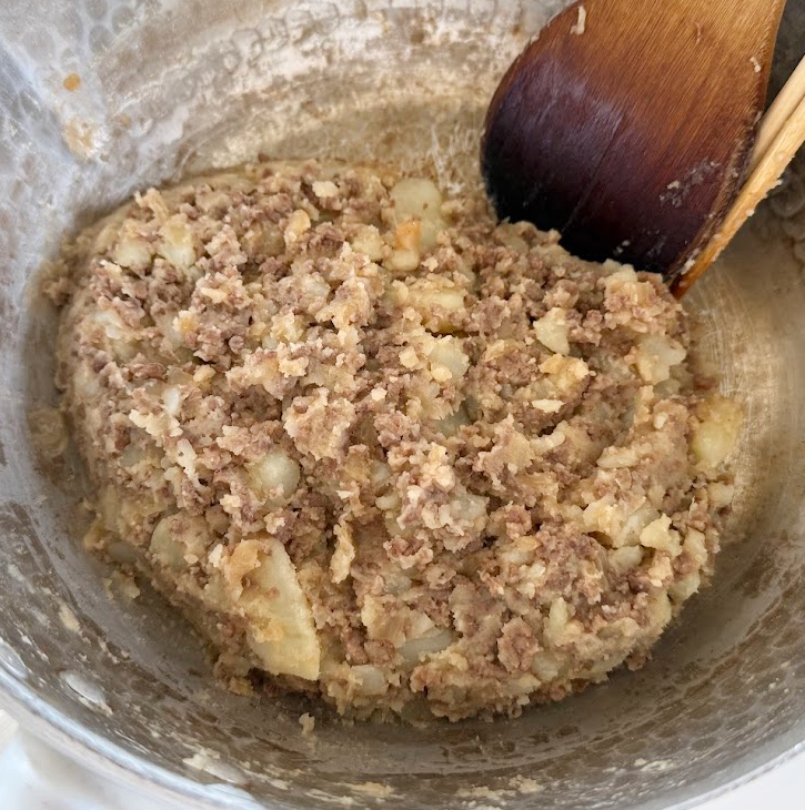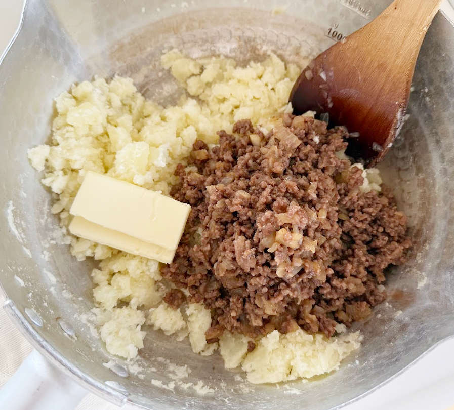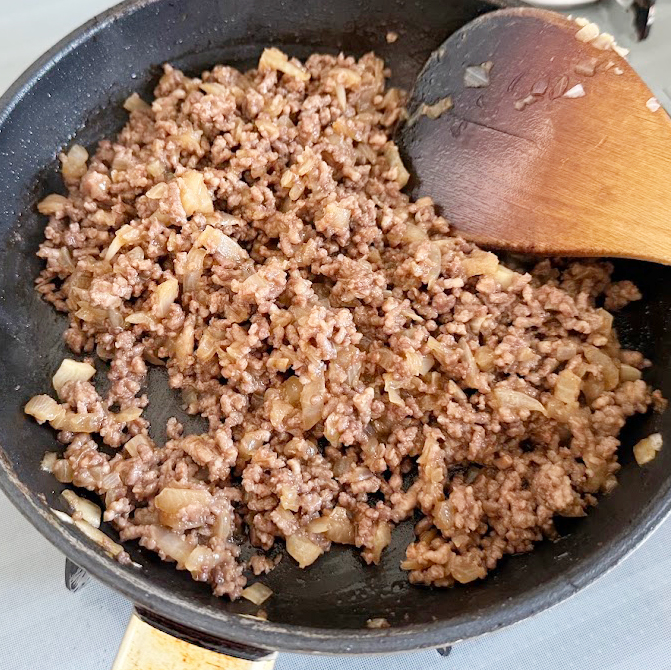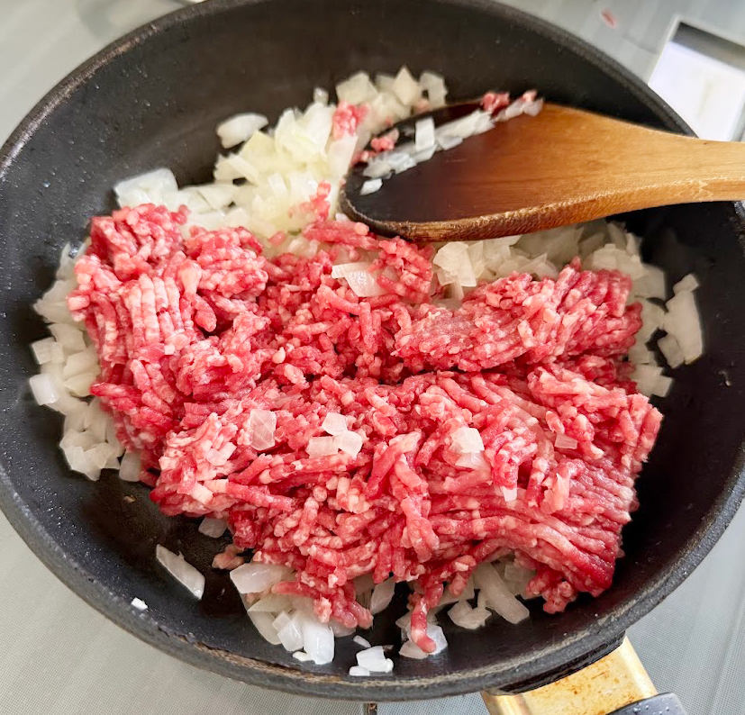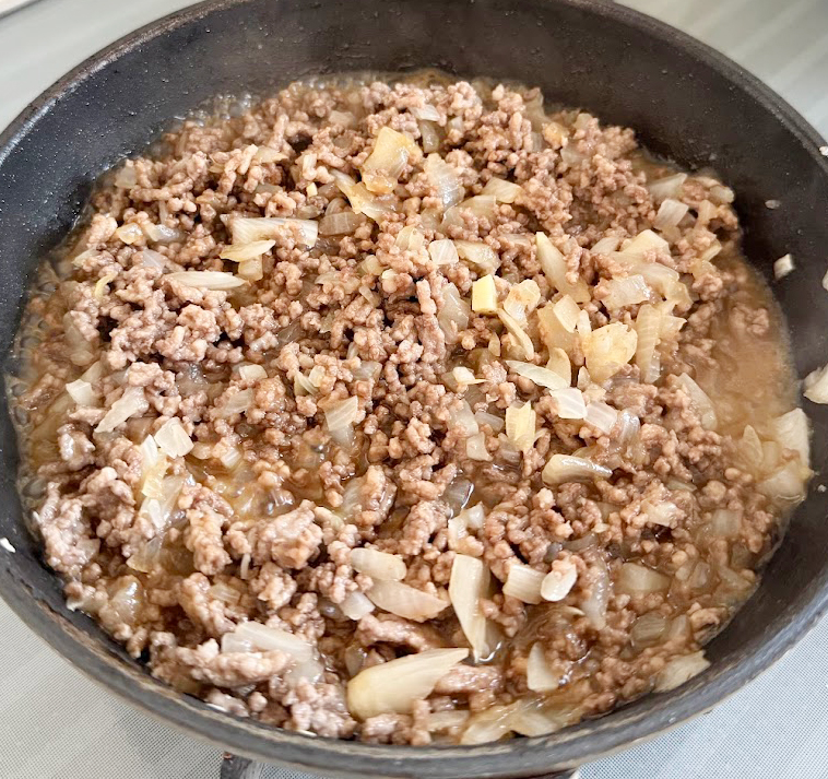 ❸フライパンに油をひき、タマネギをしんなりするまで中火で炒める。ひき肉を加えて色が変わるまで炒めたらⒶを加えて煮詰める。火を止めて❷とバターを入れてよく混ぜ、粗熱を取る。