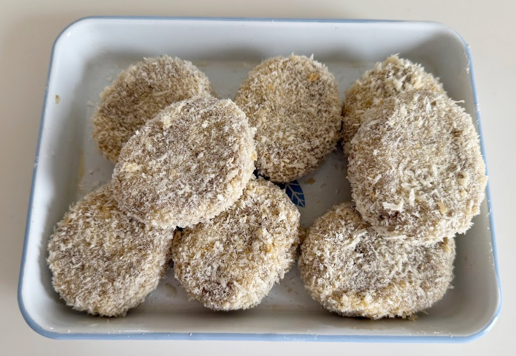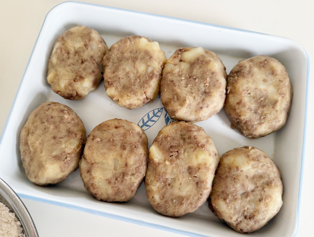 ❹ ❸が冷めたら8等分して小判型に成型する。薄力粉をしっかりとまぶし、卵液をくぐらせ、パン粉をつける。