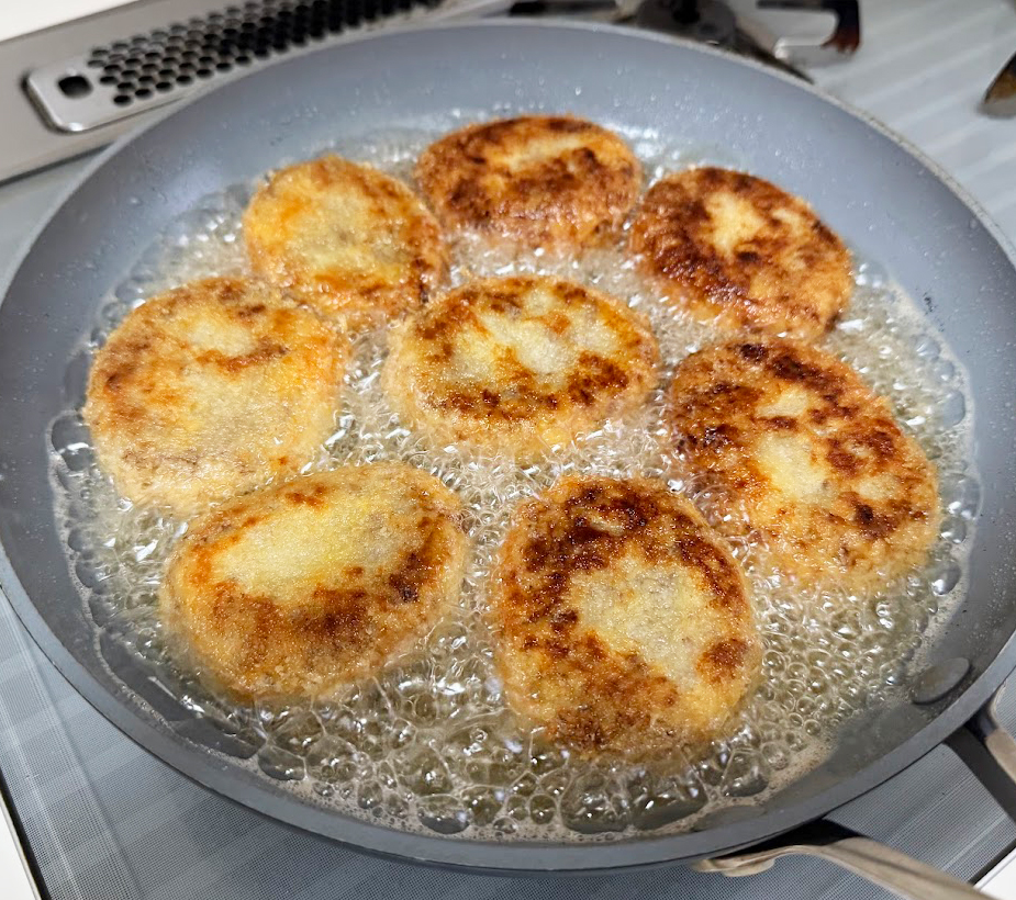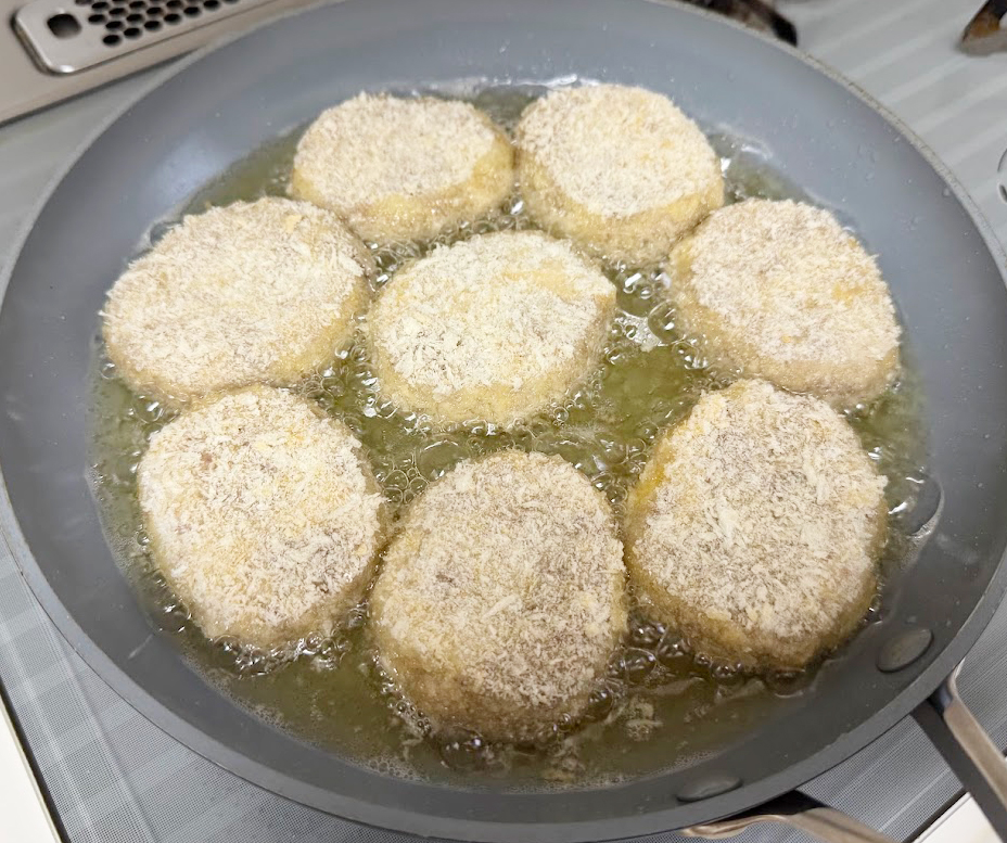 ❺フライパンに1cmくらいの油を注いで160℃に熱し、❹を揚げ焼きにする。裏返しながら3~4分ほど揚げ、こんがりキツネ色になったらバットに取り出す。
