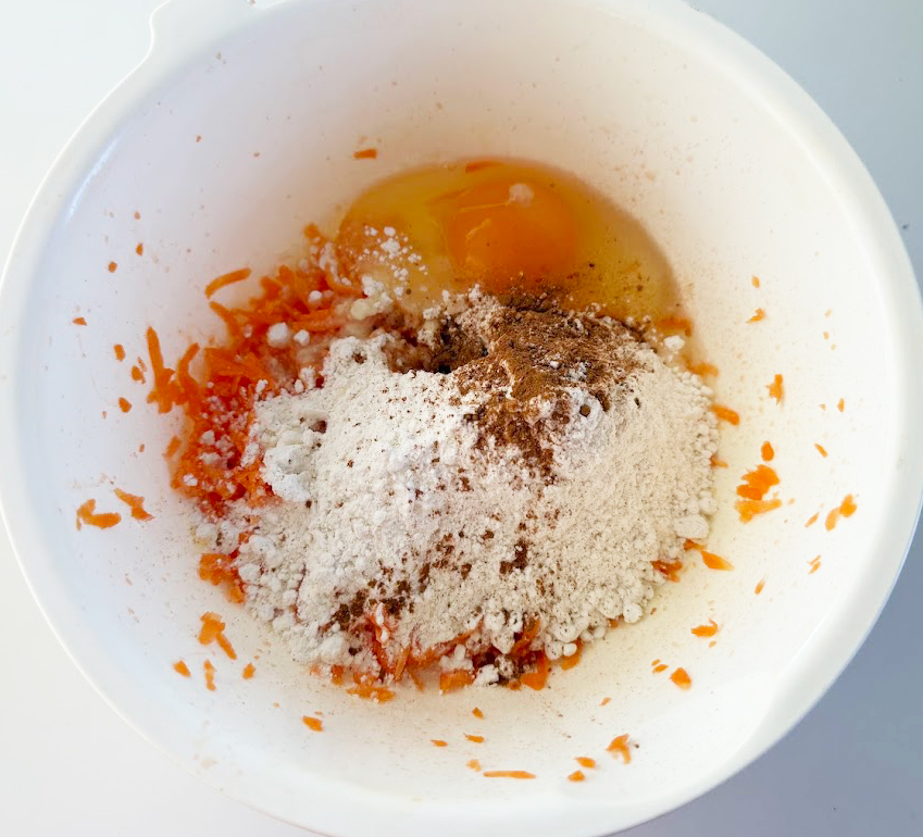 ❶ニンジンは細切り器(千切り器)でおろす(なければおろし器で良い)。ボウルにニンジン、卵、砂糖、ホットケーキミックス、こめ油、シナモンパウダーを入れてフォークでなめらかになるまで混ぜる。
