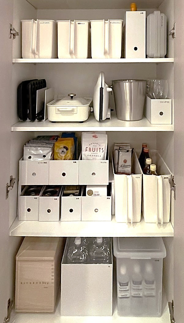 食品などをしまう際は、収納ケースを引き出しのように使い、この中に入る量だけ持つと枠を決めることで在庫の管理がしやすくなります。