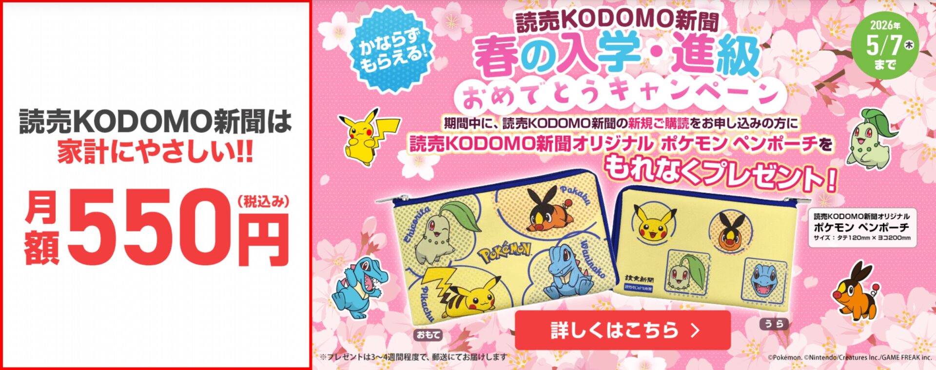 2026年5月7日(木)まで、新規ご購読で「読売KODOMO新聞オリジナル ポケモン ペンポーチ」がもらえる「春の入学・進級おめでとうキャンペーン」を実施中❗