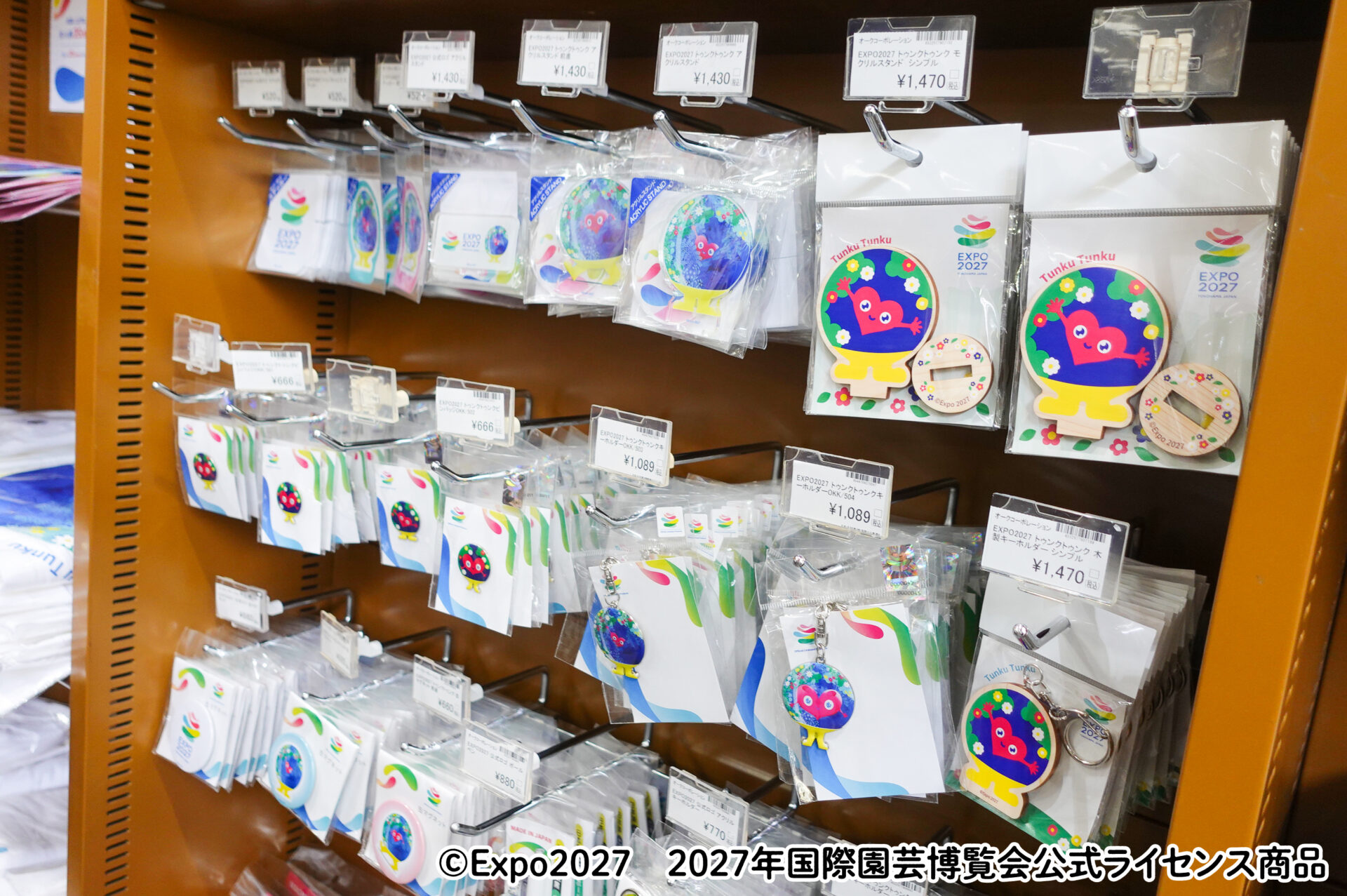 同店1階の大阪・関西万博オフィシャルストアの隣に設けられたスペースには公式マスコットキャラクター・トゥンクトゥンクのボールチェーンマスコットのほか、ノートやメモ帳などの文房具、Tシャツや帽子などのアパレル、ピンバッジ、キーホルダーなどが並んでいます。