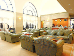 質の良さでも評判の老人ホームで、玄関を入ると、いきなりエレガントなロビーが✨ 高級ホテルみたい✨