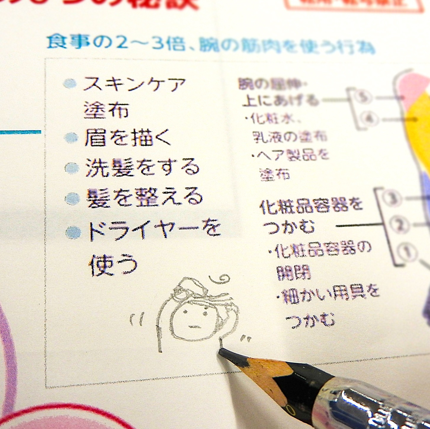 「指先を使ったり、腕を上げ下げしたりして、メイクや洗髪・整髪の時に使われる筋肉は、意外と多いんですよ」