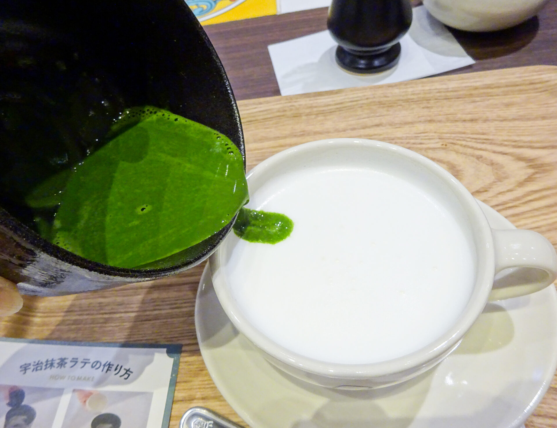 宇治抹茶ラテは「宇治和束園」の抹茶を使用し、茶せんでたてたお茶を牛乳に注ぐスタイルで、同店の大人気メニュー。