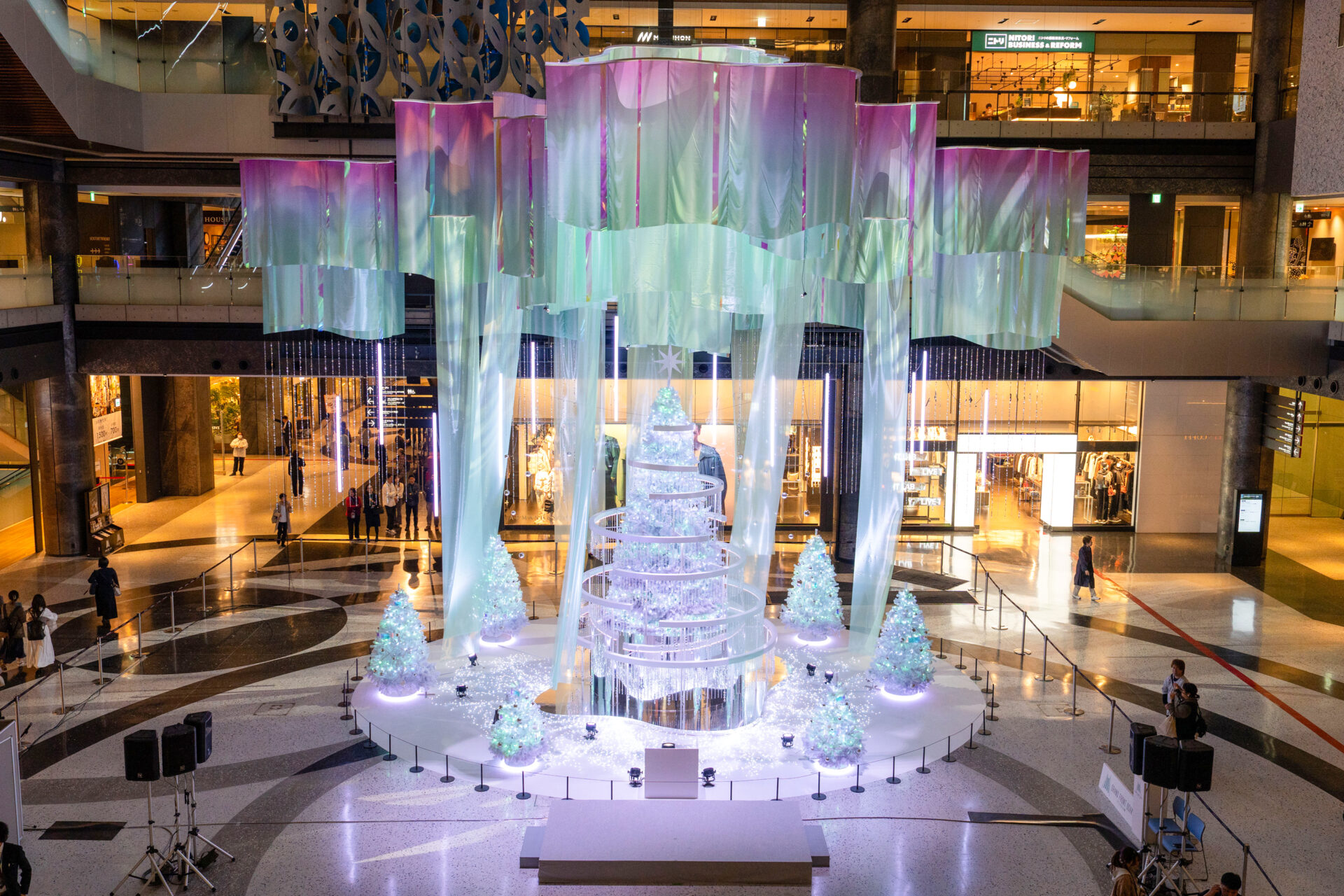 総長70mの“光のベール”が降り注ぎ、オーロラがモチーフのツリーが輝きます。