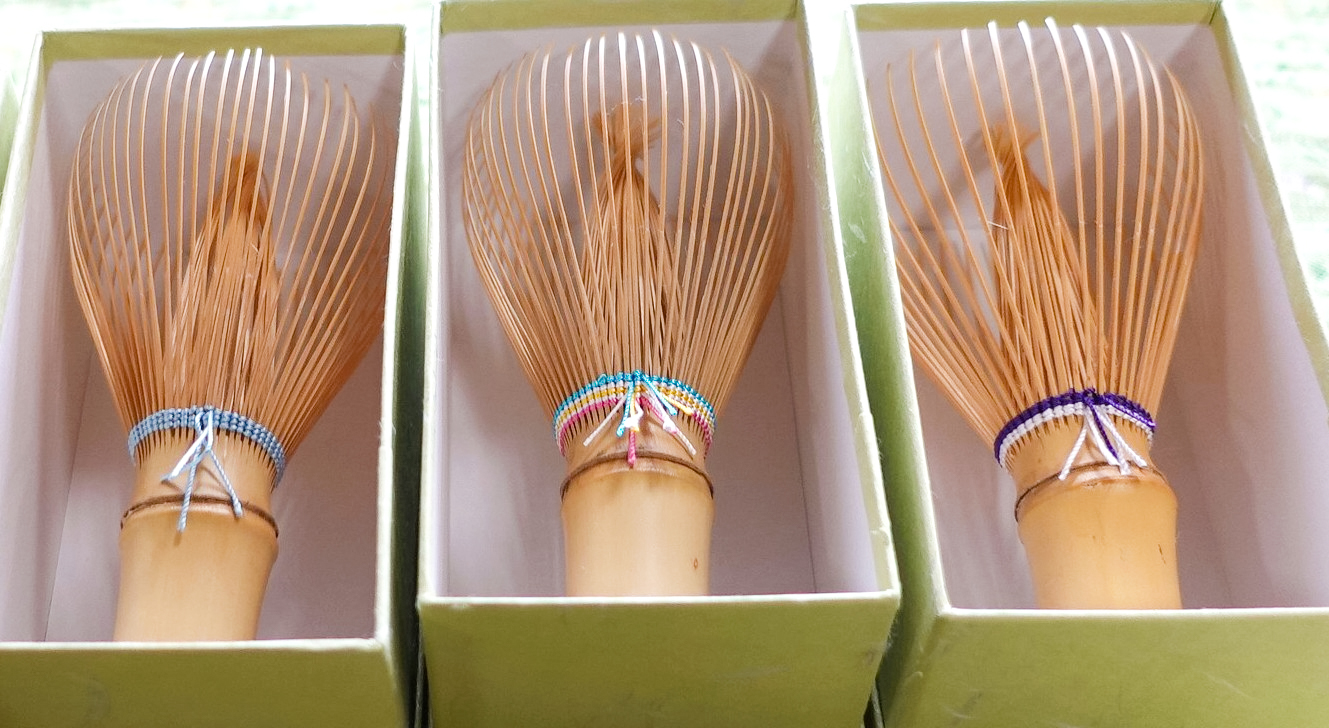 表千家は赤茶色の煤竹、裏千家は白竹、武者小路千家では紫竹で穂先がまっすぐな茶筅が使用されるなど、流派ごと素材や形状、糸の色などが異なっています。