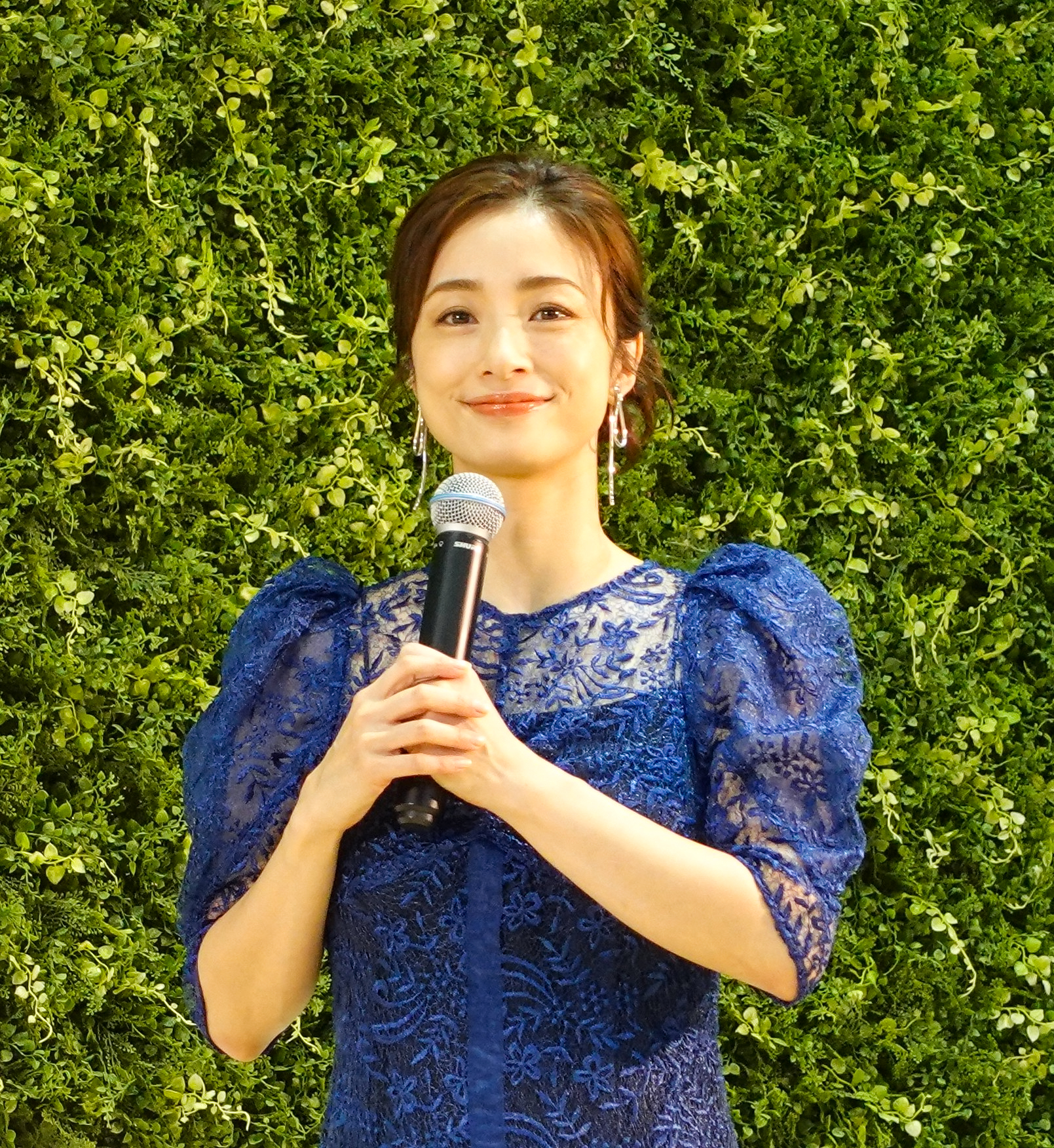レースをあしらったブルーのドレスにシルバーのパンプスで登場した上戸さん。