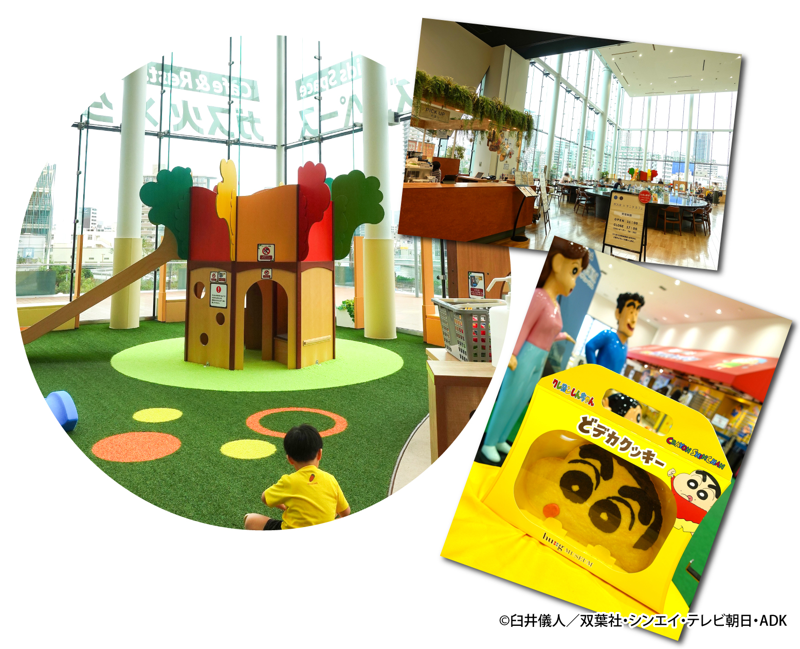 ▲左から時計まわりに、ボーネルンドが設計プロデュースしたキッズスペース、タニタカフェとコラボした「ガス火×タニタカフェ」、クレヨンしんちゃんの「どデカクッキー」がつくれる「オラのガス火キッチン」