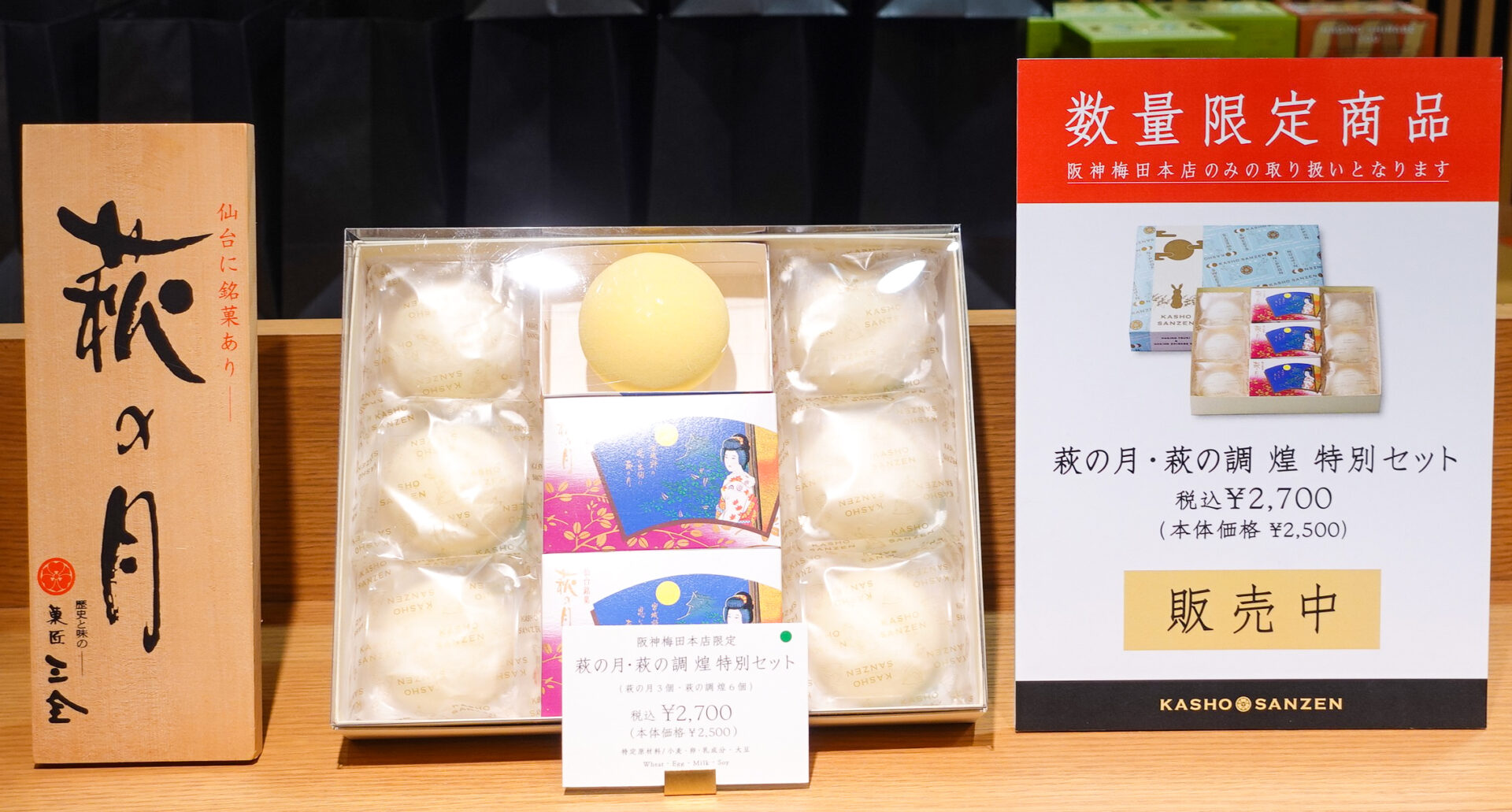 阪神梅田では、オープン記念として、「萩の月」と「萩の調 煌」の特別セットを販売しています。(12月31日まで)
