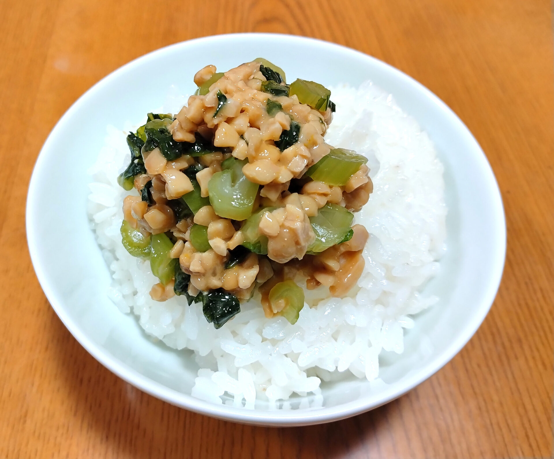 きざんだ野沢菜と合わせると、シャキシャキした食感が加わって、いい感じの〝ご飯のお供〟になりました。割ってあることで、いろんな食材とうまく合わさって、アレンジの幅が広がりそうな納豆でした。