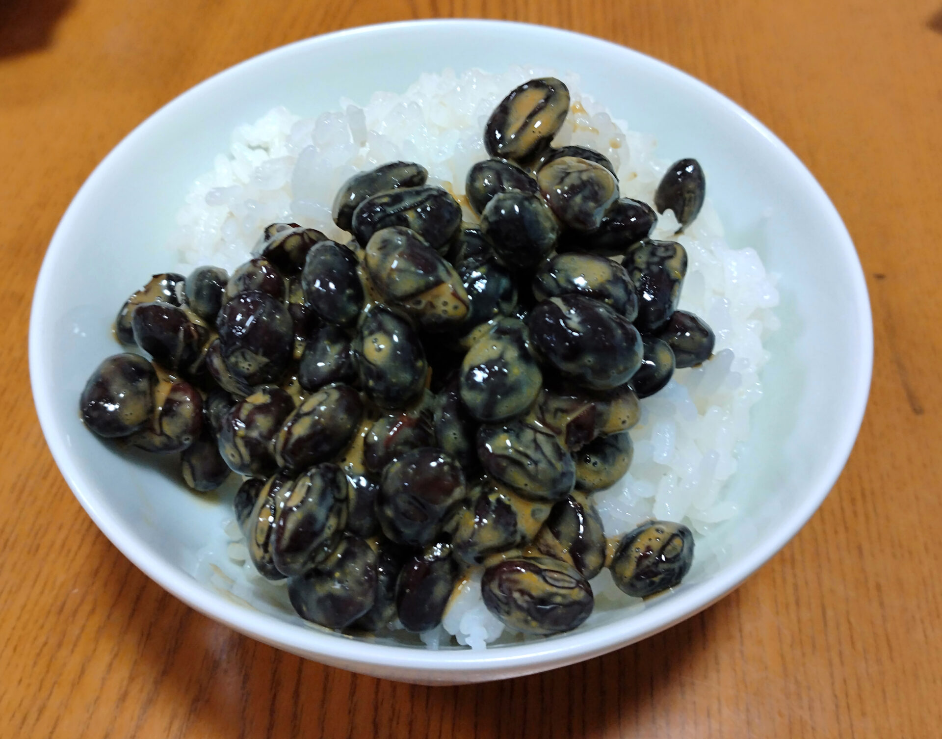 「丹波種 黒豆納豆」は、パックを開けて混ぜると、大粒の黒豆納豆の皮がツヤツヤになっていて、しっかりした皮の食感ともちもちした食感がとても美味でした。粒が大きいので、付属のタレと辛子で納豆自体の味を楽しんだ後は、少しだし醤油を垂らしてご飯と一緒にいただきました。上品な味わいの納豆でした。