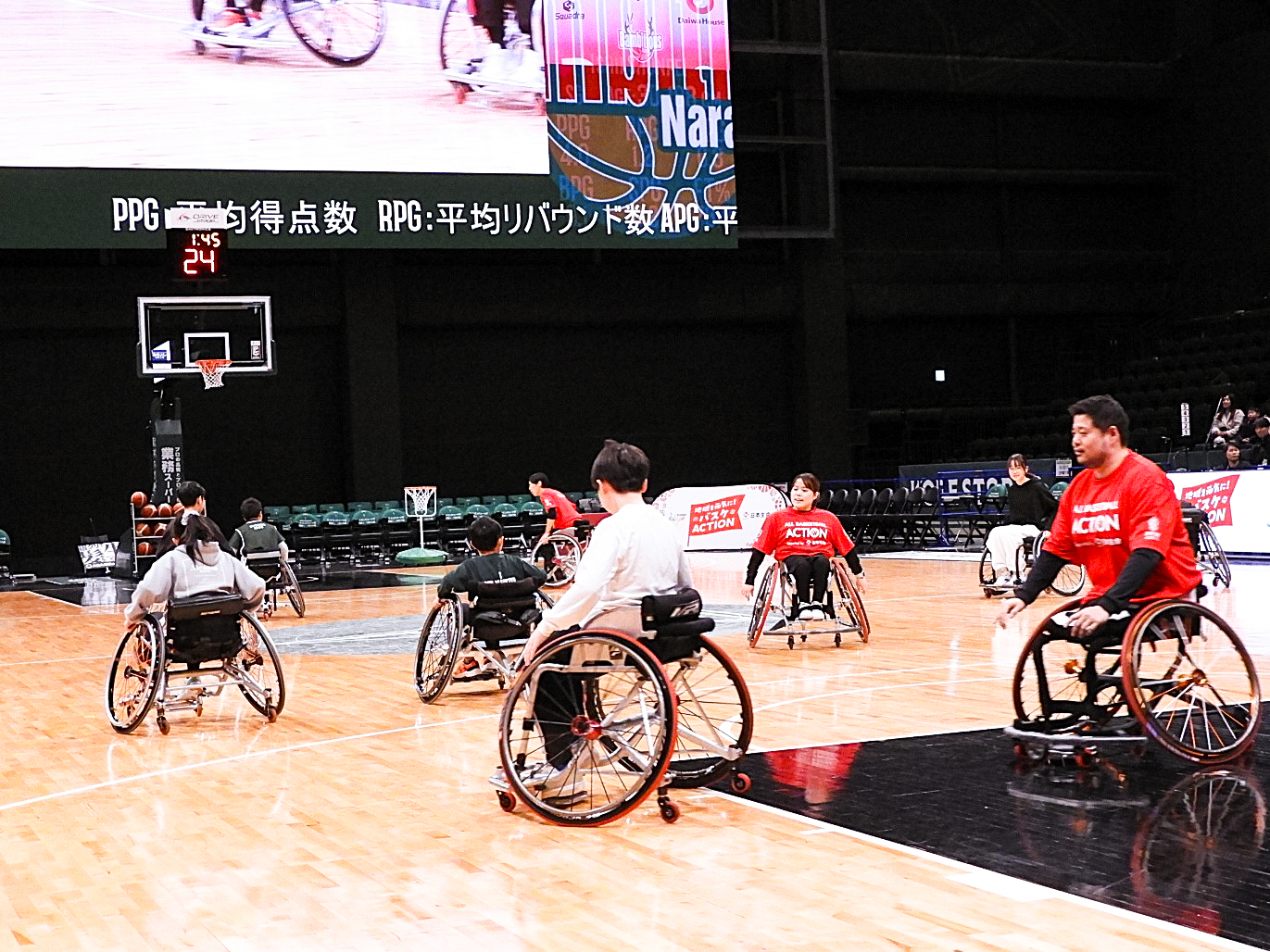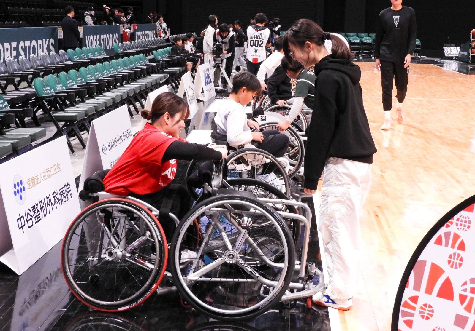 メインアリーナで「車いすバスケ体験会」と「車いすバスケットボールのスキルチャレンジ」、屋外の広場で「誰でも車いすフリースローチャレンジ」が行われ、参加者は見るだけでなく、体験することで、車いすバスケの魅力に加え、〝違いを楽しむ〟〝不便を面白さに変換する〟など新しい発想にも触れていました。